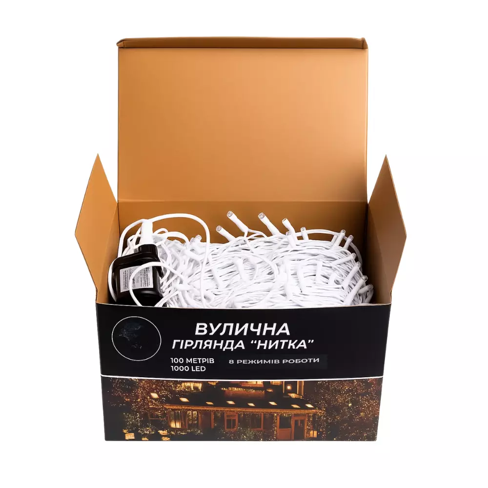Вулична гірлянда Нитка завдовжки 100 метрів – універсальне рішення для декорування екстер'єру. Пристрій дозволяє створити масштабне світлове оформлення великих територій, фасадів і вивісок. Гірлянда пропонує 8 режимів свічення, що дозволяє вибрати кращі світлові ефекти в залежності від ситуації та настрою.