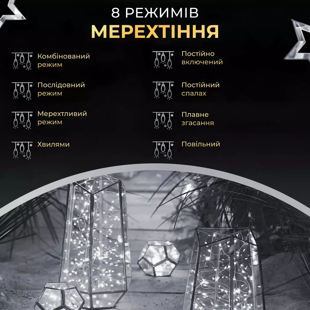 Гірлянда має 8 режимів роботи, перемикатися між якими можна за