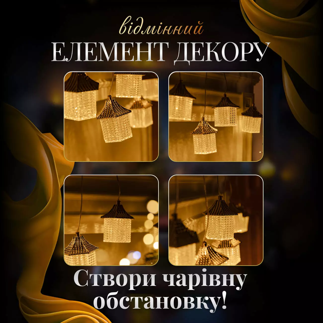 Гірлянда-штора з об'ємними фігурами будиночків у китайському стилі – чудовий варіант для створення святкової атмосфери. Гірлянда складається з 6 фігур, має оптимальну довжину для використання вдома або в офісі, оформлення фотозон та віконних отворів. Фігури виготовлені з акрилу, мають фактурну поверхню, що імітує кришталь. Завдяки цьому теплі промені світла ефектно заломлюються у гранях, створюючи чарівні ефекти.