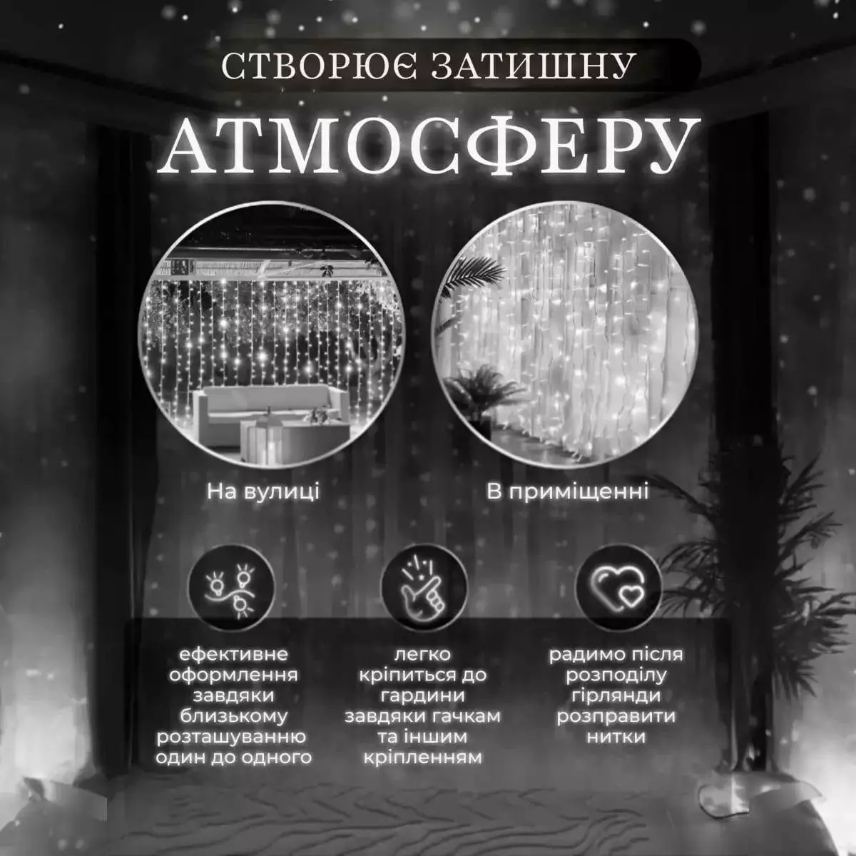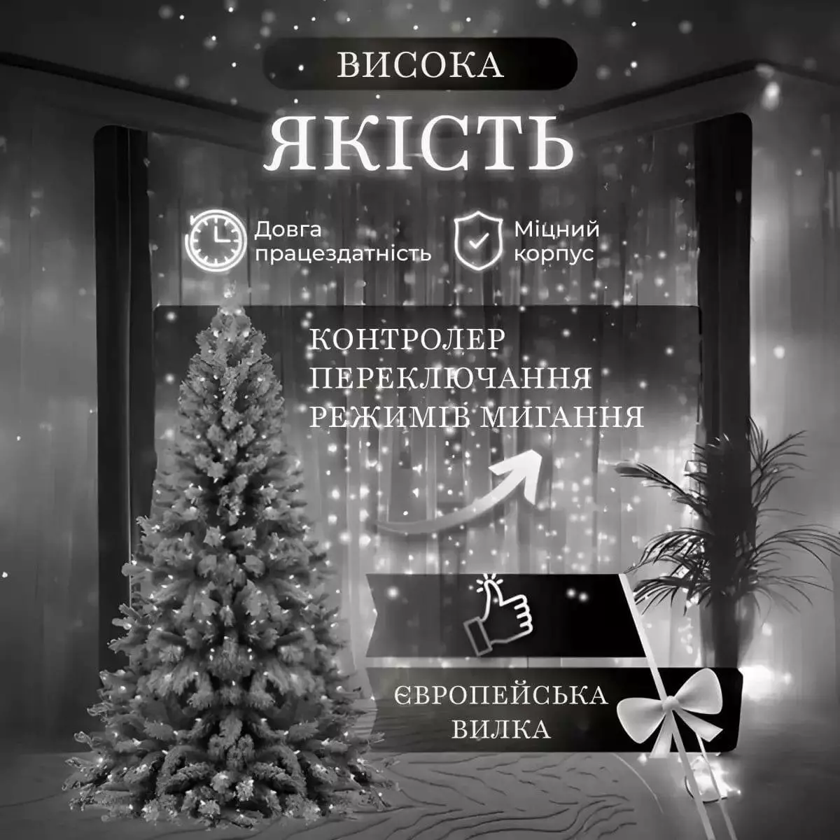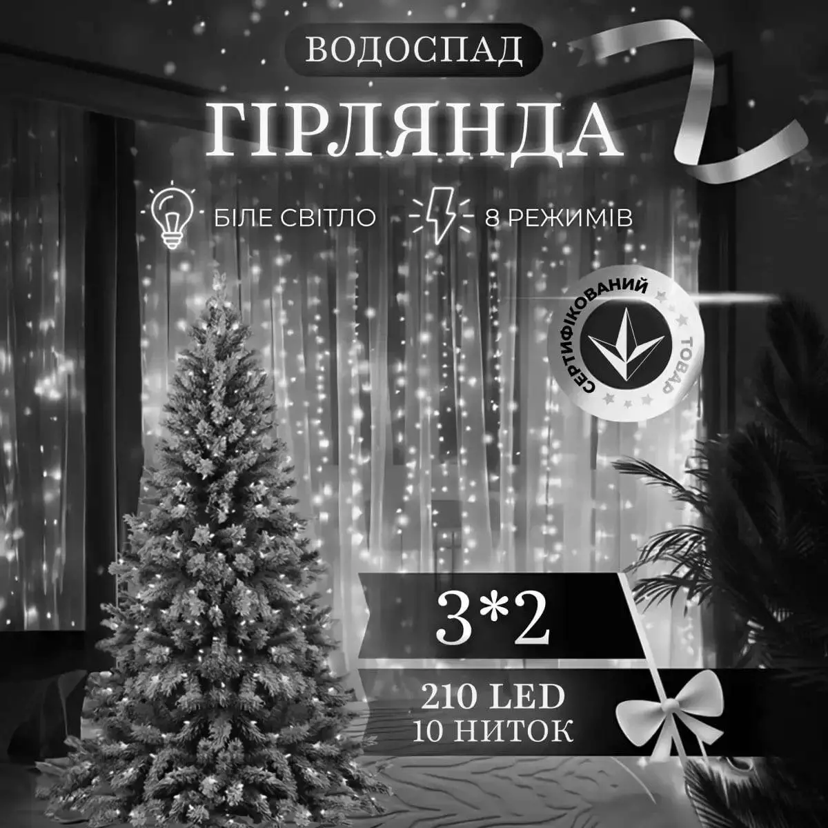 - Чарівний ефект: 210 білих світлодіодів на 10 нитках різної