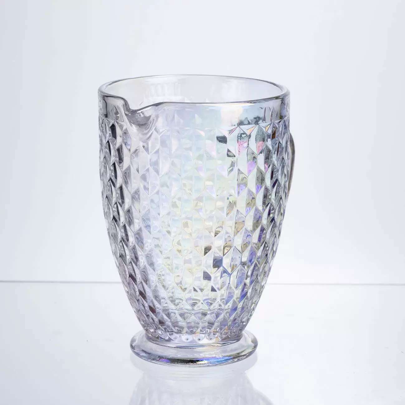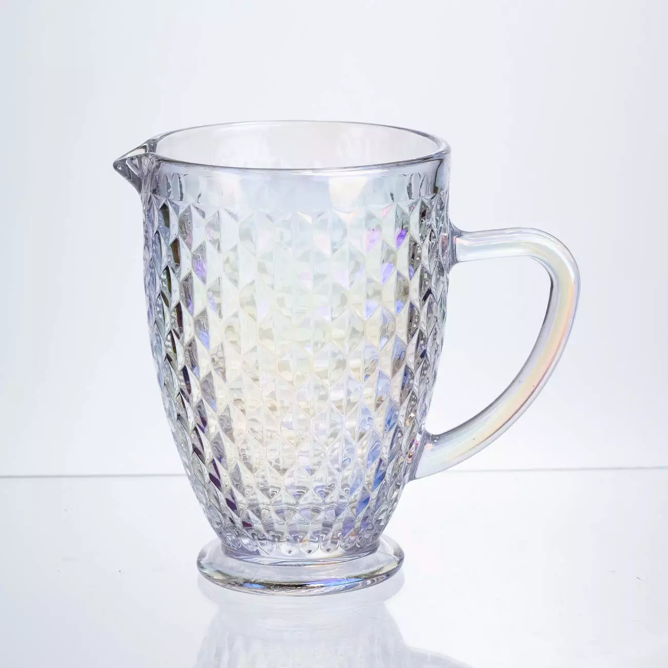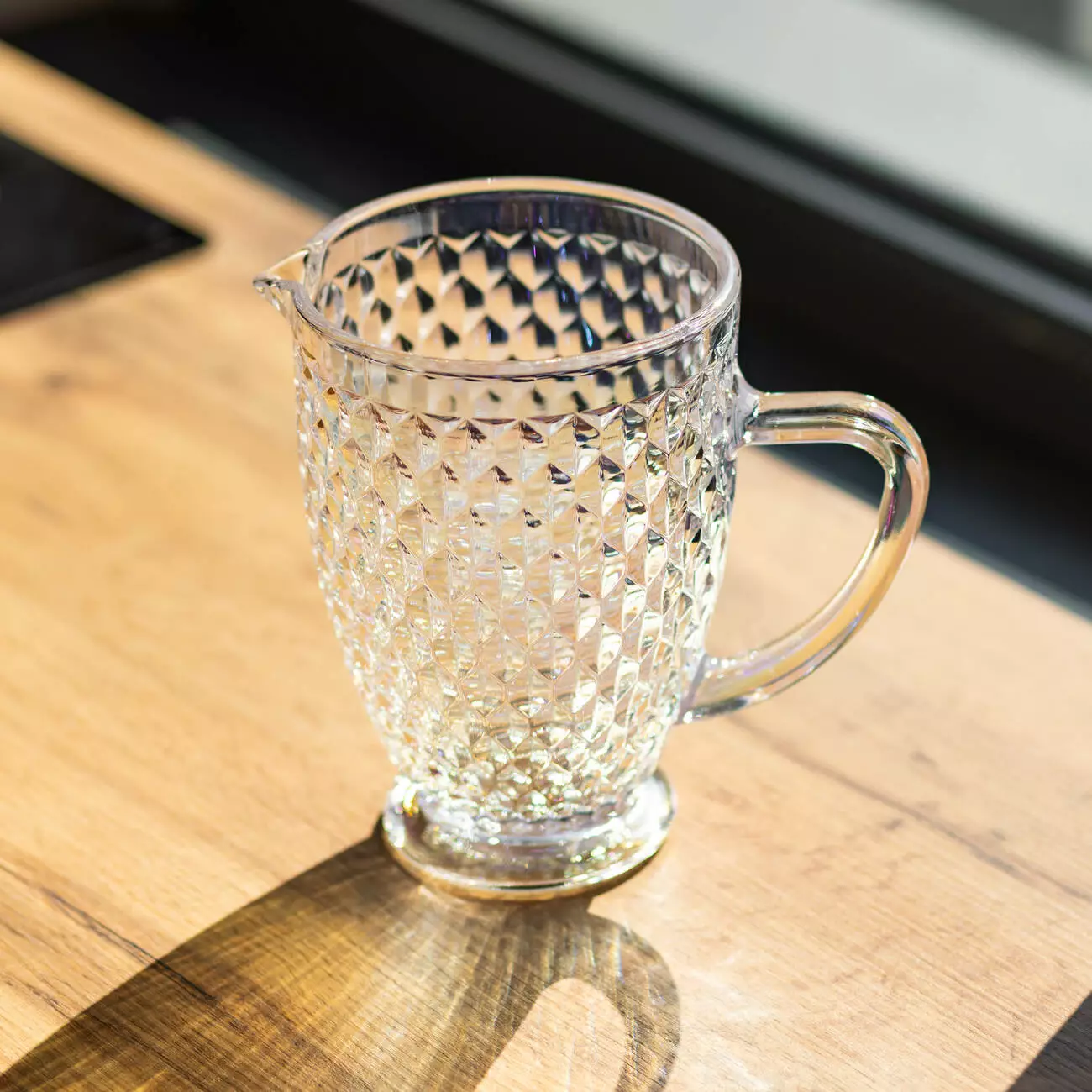 Глечик для напоїв об’ємом 1.2 л виготовлений із товстого скла. Він має декоративну поверхню з рельєфними вигинами у формі ромбів. Такий дизайн додає візуального об'єму та сприяє грі світла на склі, що особливо помітно при сервіруванні напоїв. Прозоре скло дозволяє бачити вміст, а товсті стінки забезпечують міцність.