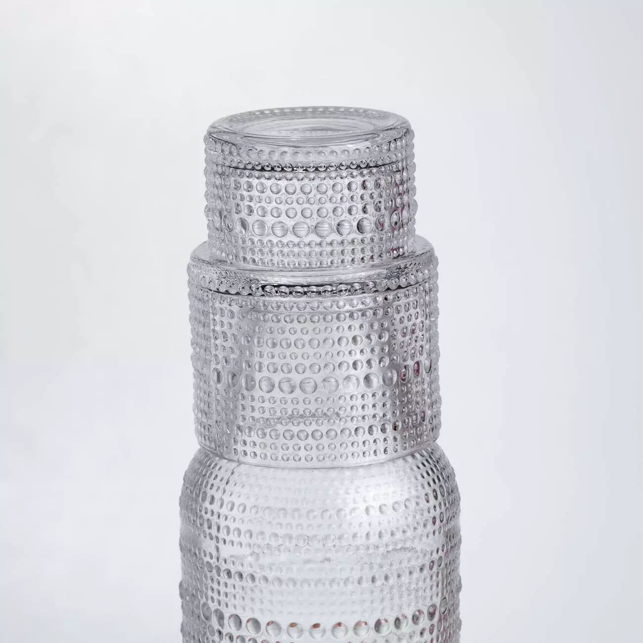 Склянка виконує роль кришки, щільно накриваючи глечик, що запобігає потраплянню пилу та зберігає свіжість напоїв. Компактна форма дозволяє легко зберігати набір у холодильнику або переносити його разом. Рельєфне скло не лише декоративне, а й практичне — воно маскує краплі води й забезпечує міцність виробу.