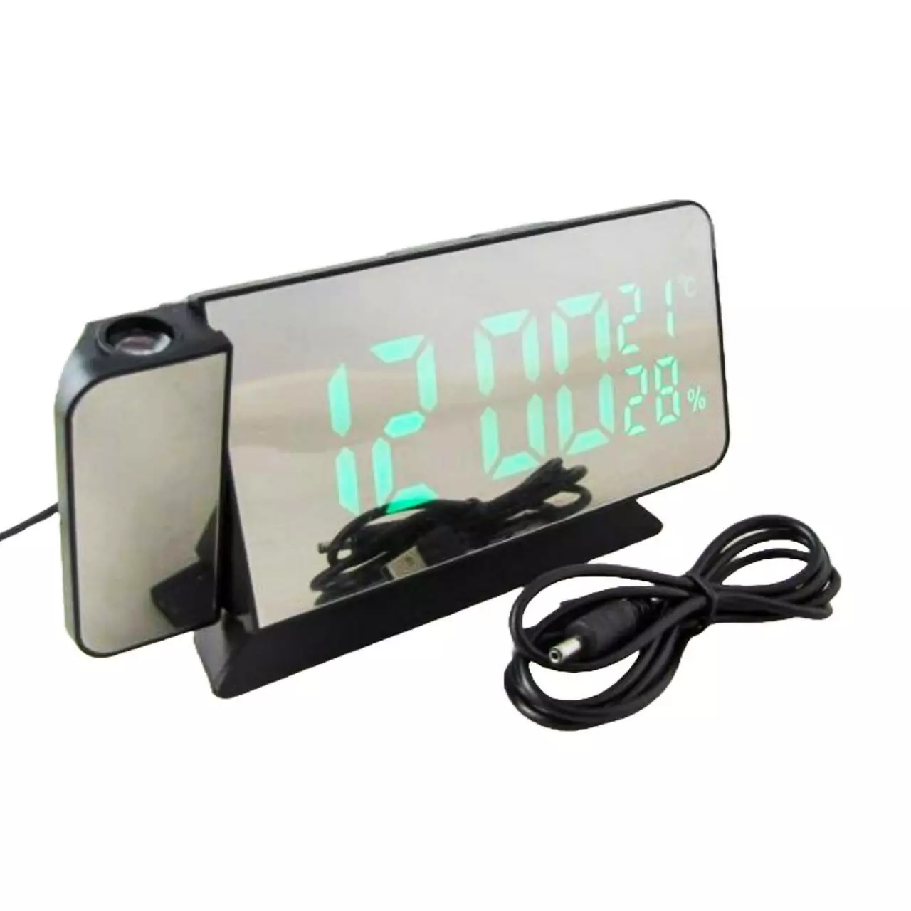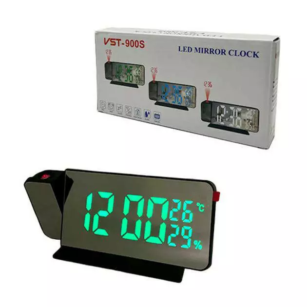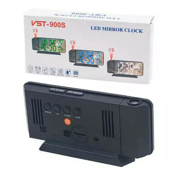 будильник, календарь, влажность, температура, проектор времени красным светом (поворот на 180 градусов), дата, батарейка CR2032 для сохранения настрое