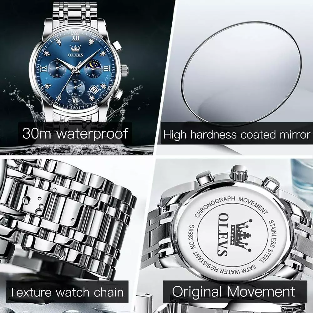 Годинник наручний OLEVS 2856 – поєднання елегантної класики та сучасних функцій. Цей годинник чудово підходить для ділового образу та повсякденного носіння. Завдяки кварцовому механізму японського походження забезпечується точний хід. Є хронограф, індикатор фази місяця і світлове покриття на стрілках – все це робить аксесуар функціональним і стильним. Міцний корпус і браслет з нержавіючої сталі, водостійкість до 3 ATM – гарантують надійність в різних умовах.
