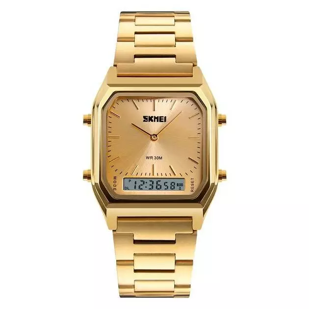 Годинник наручний Skmei - це стильний чоловічий аксесуар, що поєднує сучасний дизайн, функціональність і надійність. Короткий корпус і продумані деталі дозволяють гармонійно поєднувати модель як з повсякденним одягом, так і з діловим костюмом. Міцний браслет з надійною застібкою забезпечує комфорт та довговічність. Комбінована індикація зі стрілками та електронним дисплеєм доповнюється набором корисних функцій: відображення дати, дня тижня, місяця, секундомір, будильник, підсвічування, другий часовий пояс та вибір 12/24-годинного формату. Точний кварцовий механізм гарантує стабільну роботу, а захист від бризок робить годинник зручним для щоденного використання. Це ідеальний вибір для чоловіків, які цінують стиль, комфорт та функціональність в одному аксесуарі.