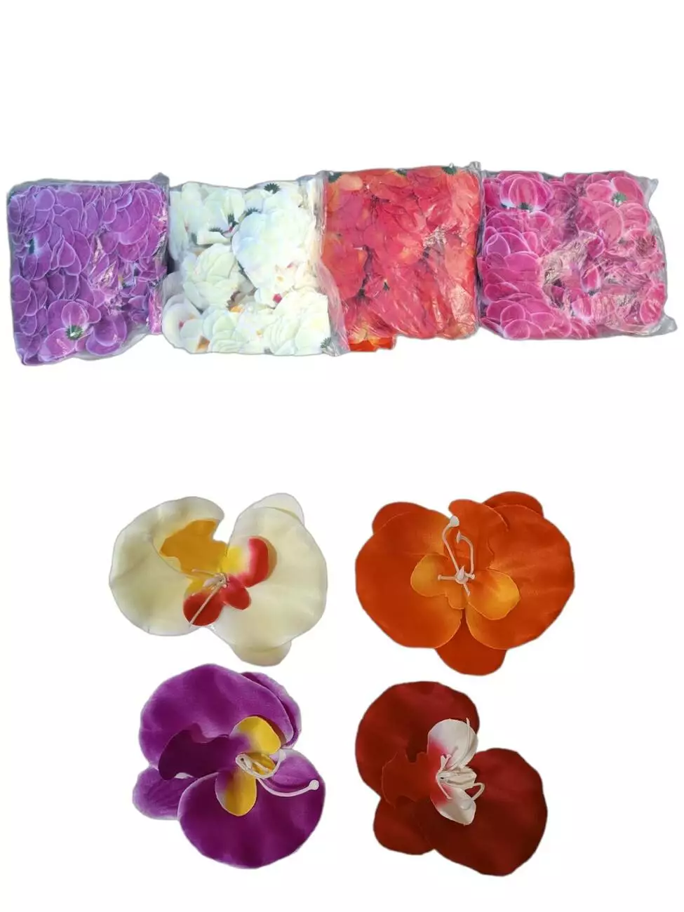 Голова штучна орхідеї з шовку діаметром 10 см. У прозорій фабричній упаковці зібрані 1000 шт різного забарвлення.