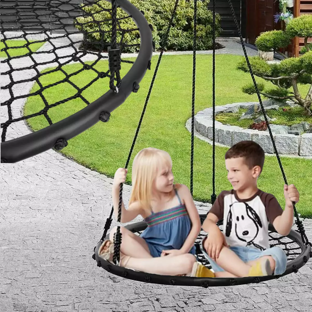 ШИРОКЕ СИДІННЯ - діаметр сидіння сягає 100 см, що забезпечує комфорт і дає змогу гратися на ньому навіть кільком дітям. Сидіння виготовлене з плетених мотузок із поліетилену, які забезпечують надійне зчеплення з поверхнею. Гойдалки виготовлені з високоякісного матеріалу, що робить конструкцію стійкою до атмосферних впливів.