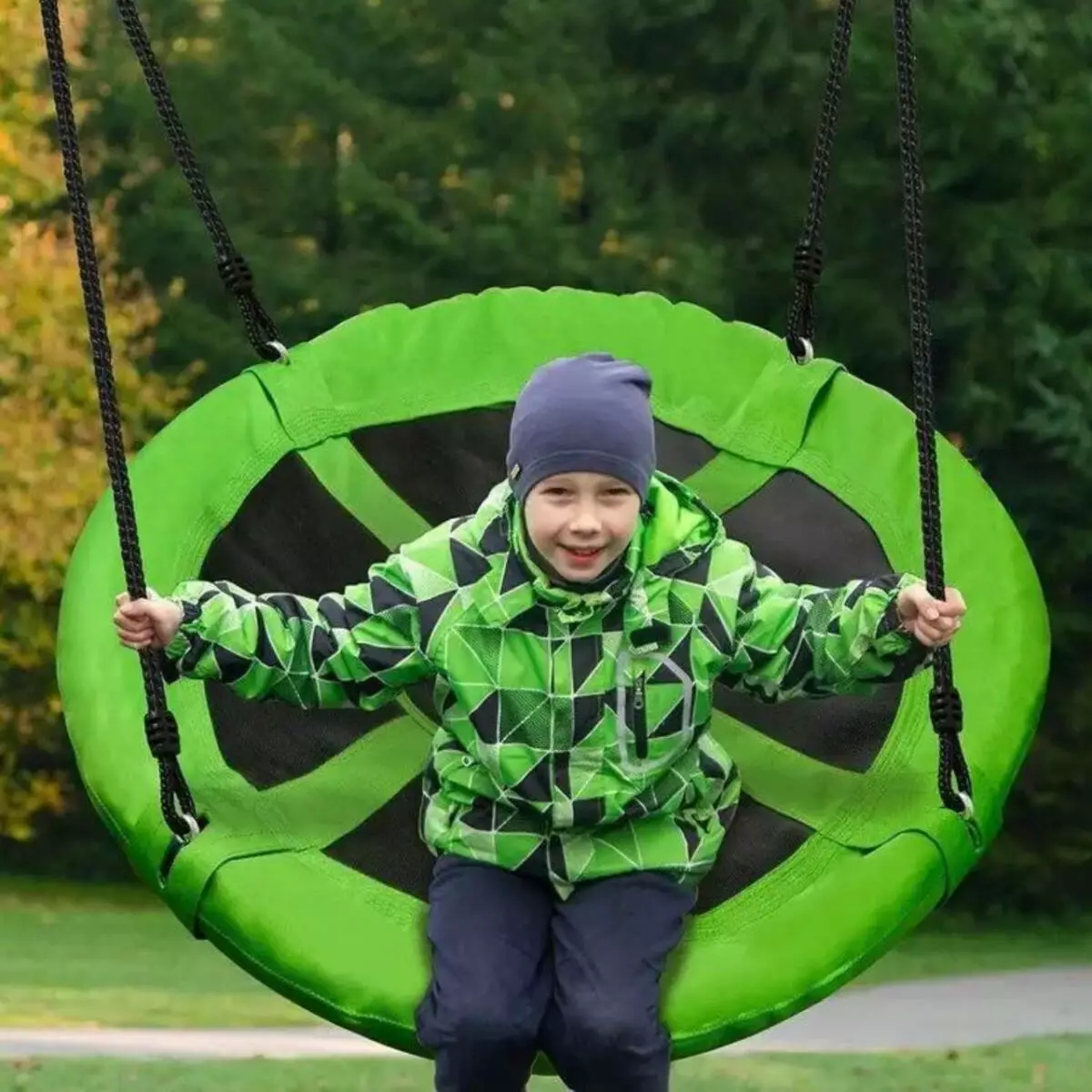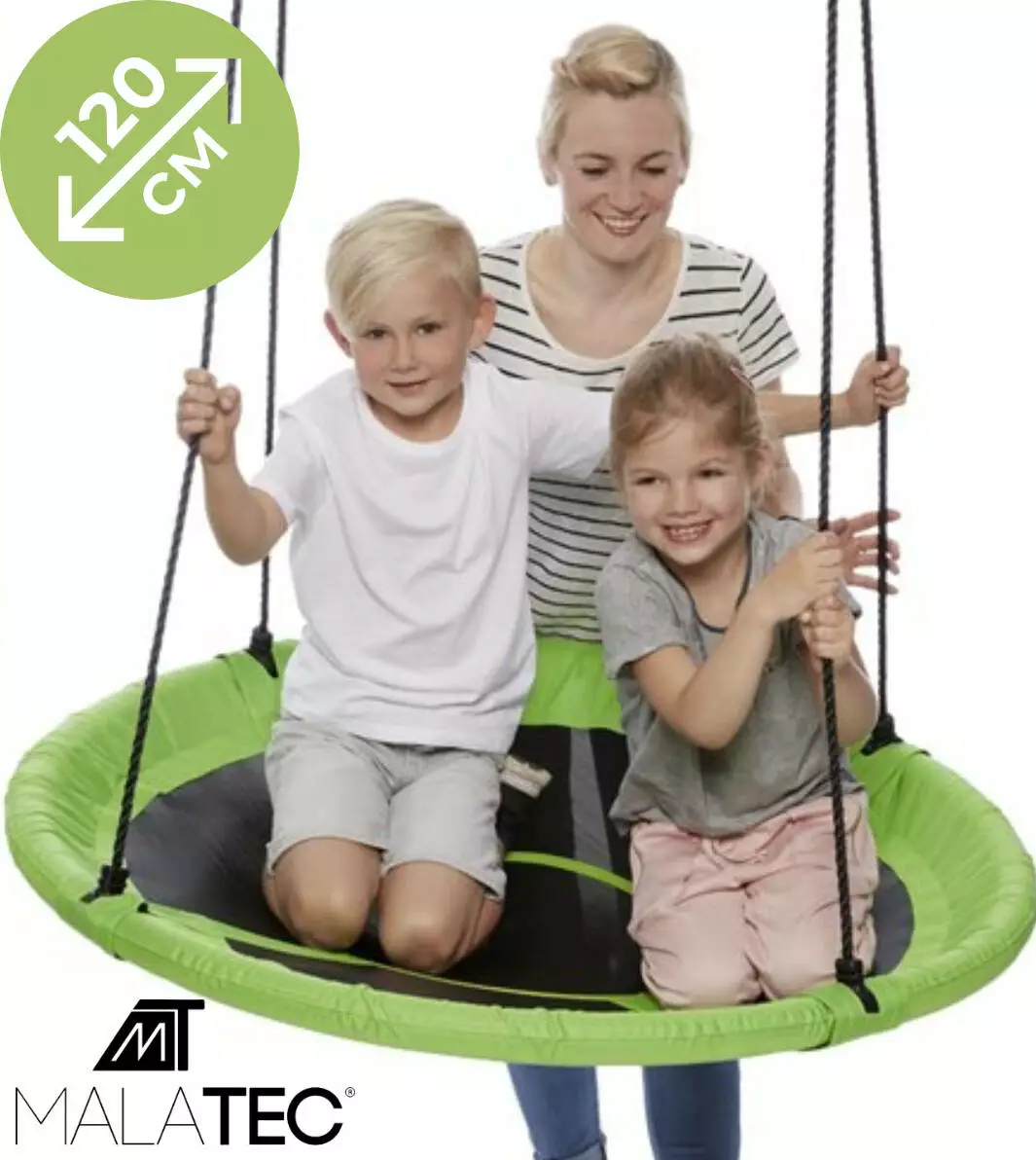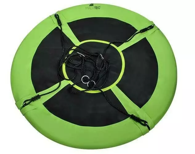 Гойдалка має широке, кругле сидіння зі сталевої рами, захищеної піною EPE, усередині якої міститься міцна поліпропіленова сітка. Вона виготовлена з тканини Oxford 600D, що гарантує безпеку гри. Вантажопідйомність до 160 кг можлива завдяки використанню плетених канатів товщиною 10 мм. Це гарантує безпеку і дозволяє навіть дорослим насолоджуватися моментами веселощів. Це ідеальний варіант для великої родини. Його розмір і форма дають змогу розміститися на ньому кільком людям.