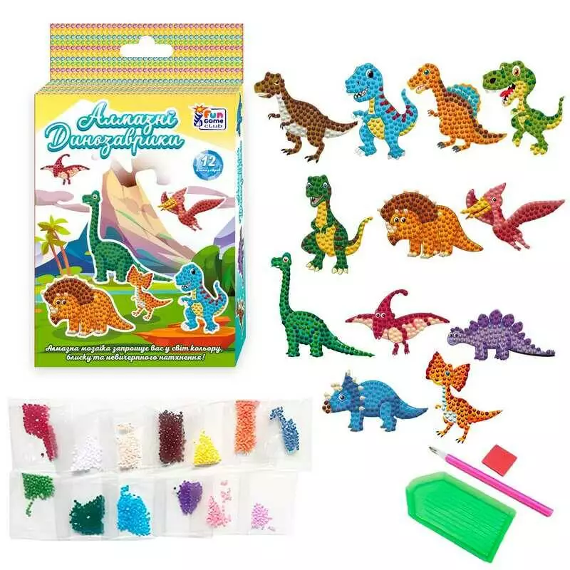 гр Алмазні стікери "Динозаврики" 10228 (60/2) "4FUN Game Club", наліпки, стилус, силіконовий клей, піддон, алмази, в коробці