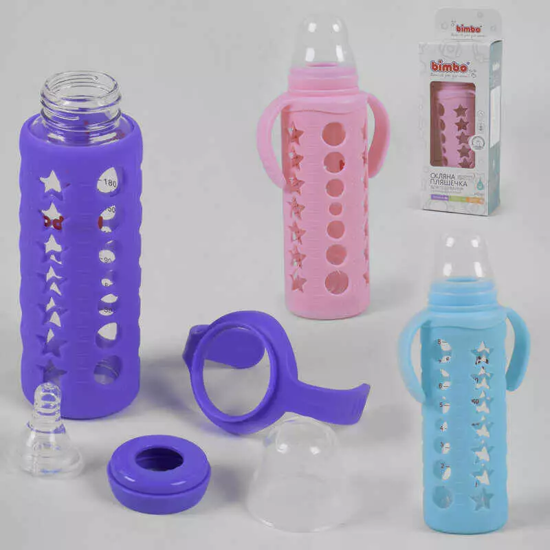 гр Бутылка стеклянная 15798 (48) с силиконовой соской, "BIMBO", 240 мл, 3 цвета, 1шт в коробке