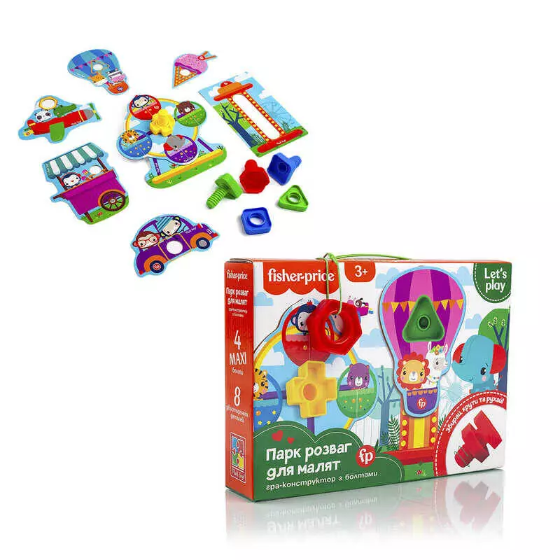 гр Гра настільна "Парк розваг. Гра-конструктор з болтами" Fisher-Price VT2905-21 (6) "Vladi Toys", 13 деталей, 4 болтика, 4 гайки