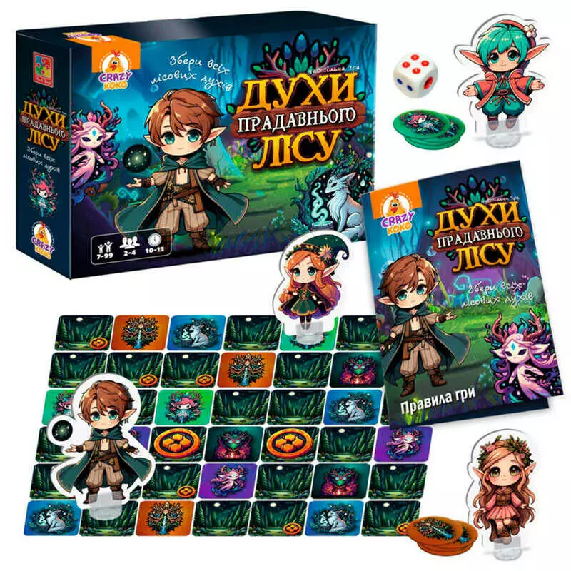 гр Гра настільна розважальна "Духи прадавнього лісу" VT8055-48 (5) "Vladi Toys", 45 плиток, 32 фішки, 20 жетонів, 4 персонажі, 1 кубик, в коробці