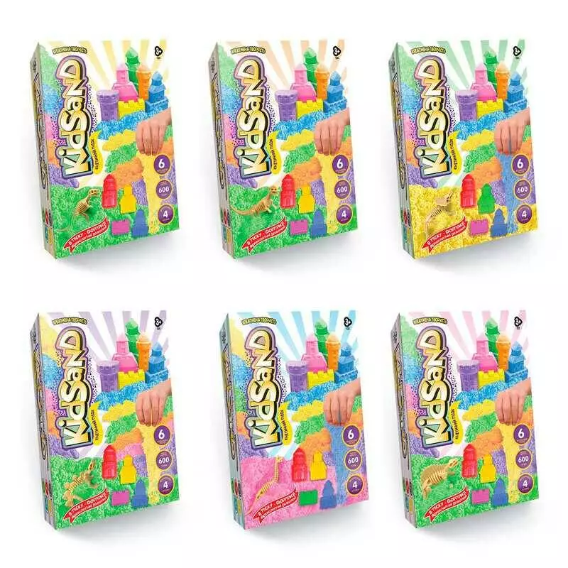 гр Кінетичний пісок "KidSand" 600г KS-04-04U,05U,06U..09U (6) "Danko Toys", 6 кольорів, 4 формочки, іграшка сюрприз, в коробці ВИДАЄТЬСЯ МІКС ВИДІВ