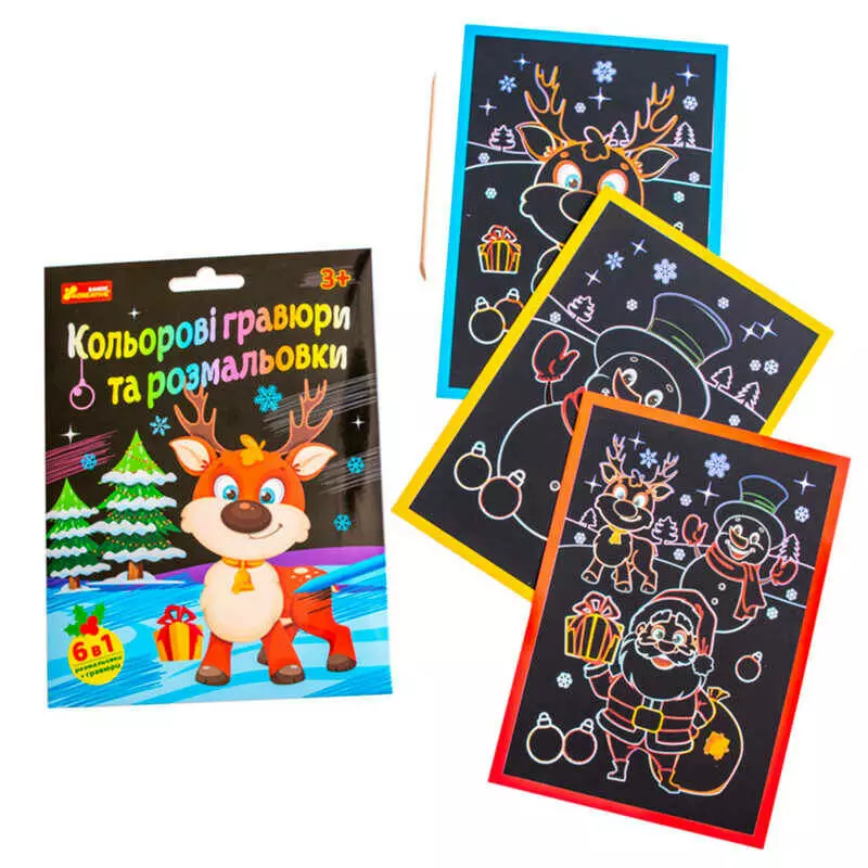 гр Кольорові гравюри та розмальовки "Новорічні" 10100748У (100) "Ранок", 3 гравюри, 3 розфарбовки, дерев’яний стилус