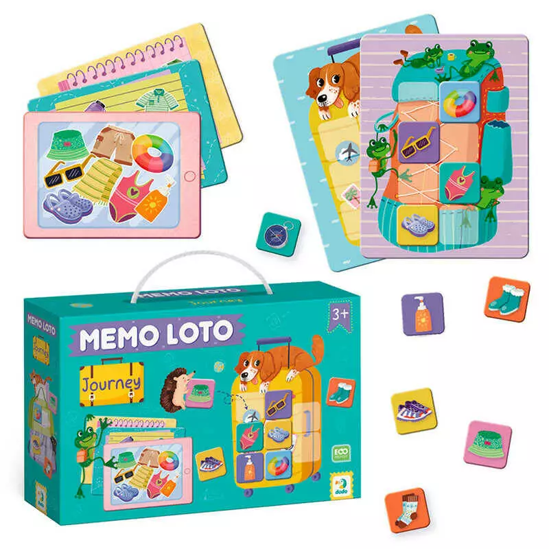 гр Мемо лото "Збираємося у подорож" 301227 (36) "Dodo", 4 картки-валізи, 4 картки-списки, 32 фішки, в коробці