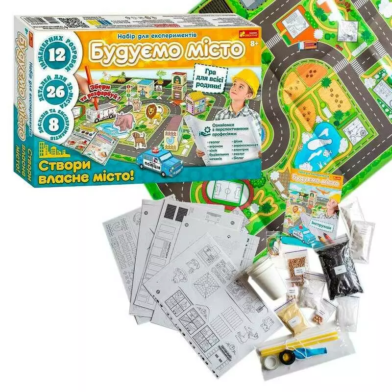 Головна > Каталог > Іграшки > Настільні ігри > гр Набір для експериментів "Будуємо місто" 10100674У (6) "Ранок", 12 інженерних проєктів, 8 наукових експериментів, 26 деталей, в коробці оптом