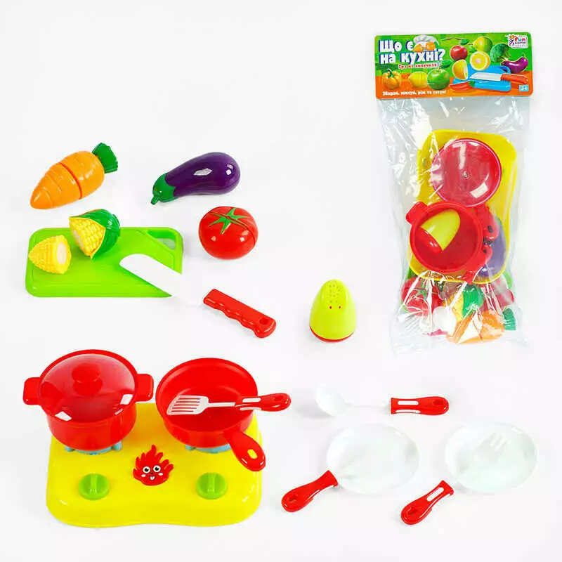 Головна > Каталог > Дитячі товари > Дитячий посуд > гр Продукти на липучках “Що є на кухні?” 65290 (120/2) "4FUN Game Club", 17 елементів, варильна поверхня, посуд, обробна дошка, у пакеті оптом