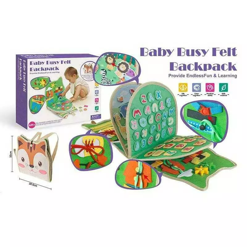 Логічна папка-рюкзак 1368 (16) фетрова, гра з липучками, англійська абетка, цифри, геометричні фігури, тварини, годинник, застібки, в коробці