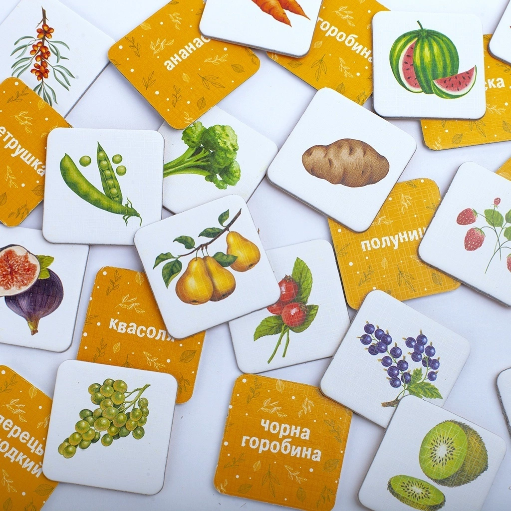 Це 56 карток із зображенням овочів, фруктів та ягід, які не лише допоможуть у навчанні дітей, розширять їх кругозір, тренуватимуть вміння розрізняти кольори, переключати увагу чи групувати за певною ознакою, а й дозволять вам разом весело провести час та нагуляти апетит! Все залежить від того, який з шести варіантів ігор ви оберете.