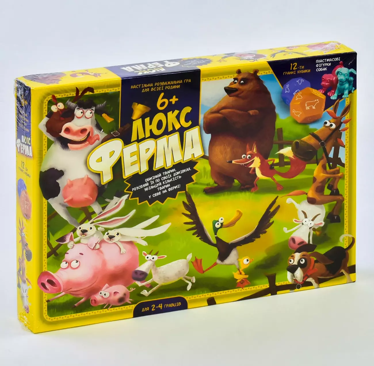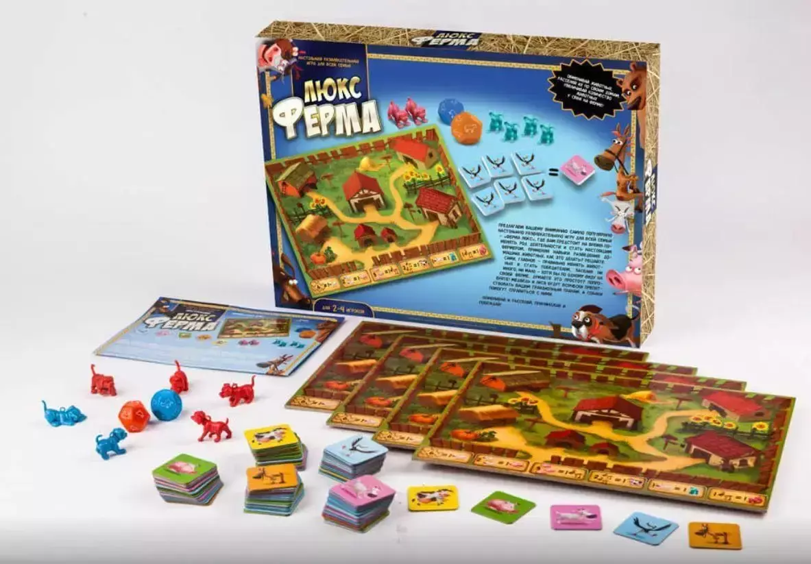 Пропонуємо вашій увазі найпопулярнішу настільну розважальну гру для всієї родини - «Ферма Люкс», де вам належить на час поміняти рід діяльності та стати справжнім фермером, застосовуючи навички розведення домашніх тварин. Мета гри: правильно міняти тварин і стати переможцем, заселивши ні багато ні мало - хоча б по одному виду на своїй фермі. Гра призначена для 2-4 гравців. У комплект входять 2 12-гранних кубика, пластмасові фігурки собак.