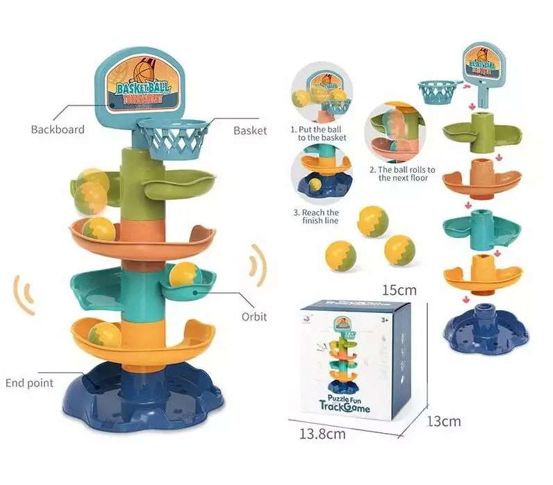 Яскрава гра з кульками стане незабутньою розвивальною іграшкою для маленьких діток віком від 18-ти місяців. Завдяки такій іграшці, малюк розвине тактильні та звукові навички, навчиться концентрувати увагу, а також ознайомиться з такими поняттями, як колір та форма. Принцип гри досить простий і інтуїтивно зрозумілий, малюк буде закидати кульки в кошик, а потім спостерігати, як різнокольорові кульки з усією швидкістю скочуються плавно долаючи кожен ярус. Особливості: - приємна, пастельна кольорова гама; - 4 різнокольорові кульки; - компактна розбірна конструкція; - розвиває тактильні відчуття, покращує сприйняття кольорів, логічне мислення і дрібну моторику рук.