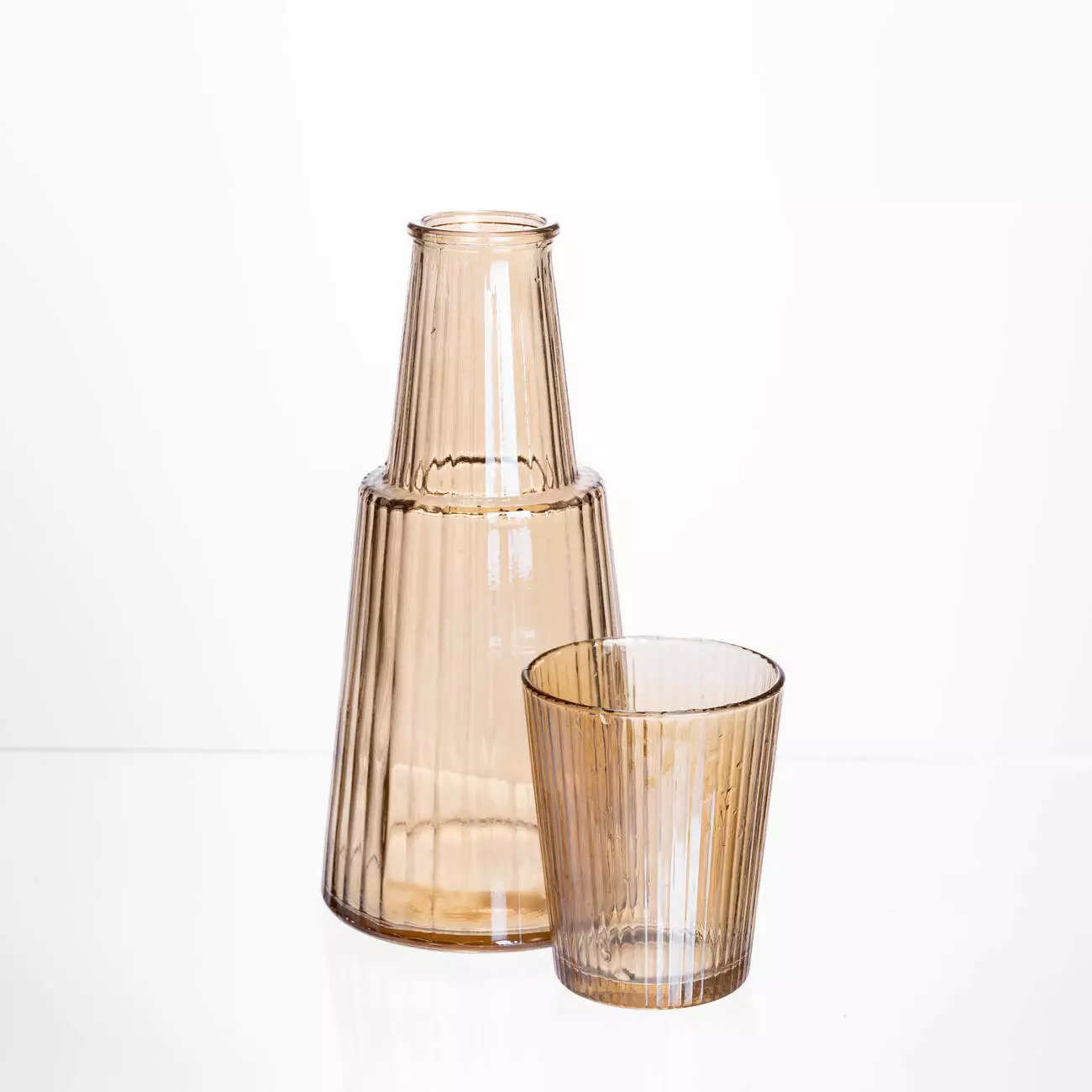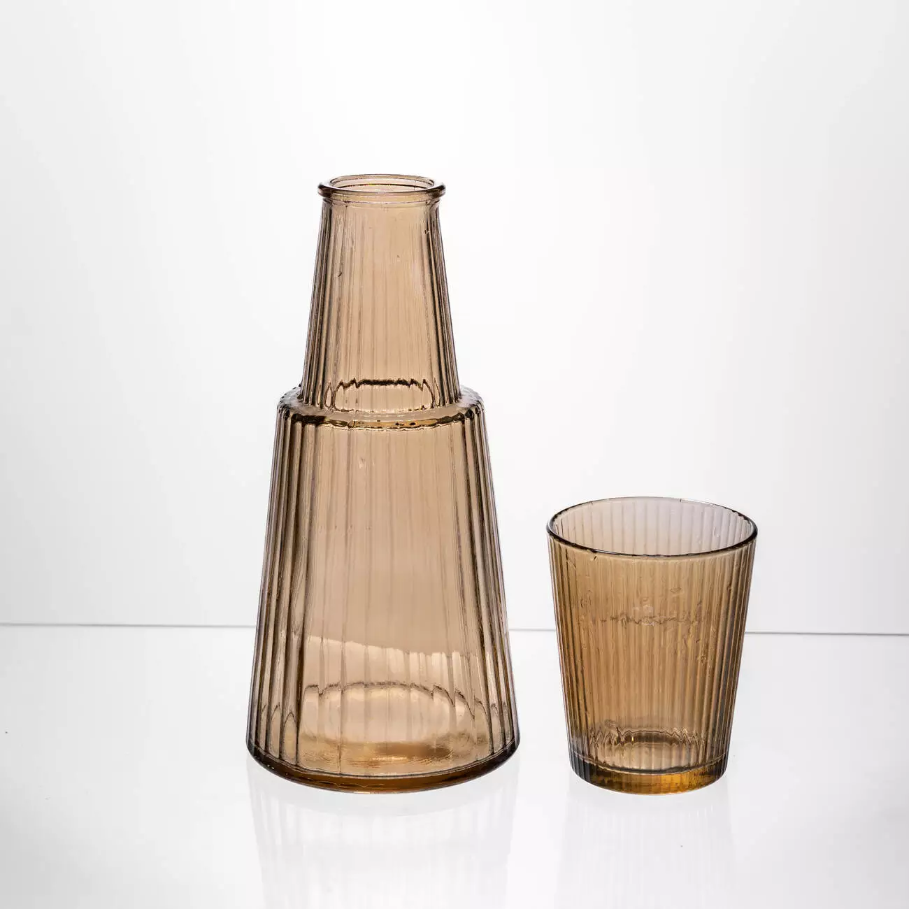 Карафе зі склянкою - практичний набір для води та прохолодних напоїв. Класична кругла форма доповнена рельєфною ребристою фактурою: вона не лише ефектно заломлює світло, а й маскує розлучення та відбитки, дозволяючи посуду завжди виглядати охайно.