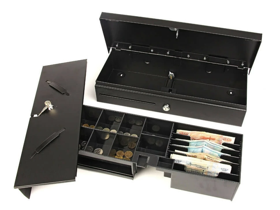 Металевий ящик для зберігання грошей має різні секції: для купюр (5 штук) і для монет (8 штук). Секції для купюр поділяються на фіксовані і регульовані. Секції для монет всі фіксовані.