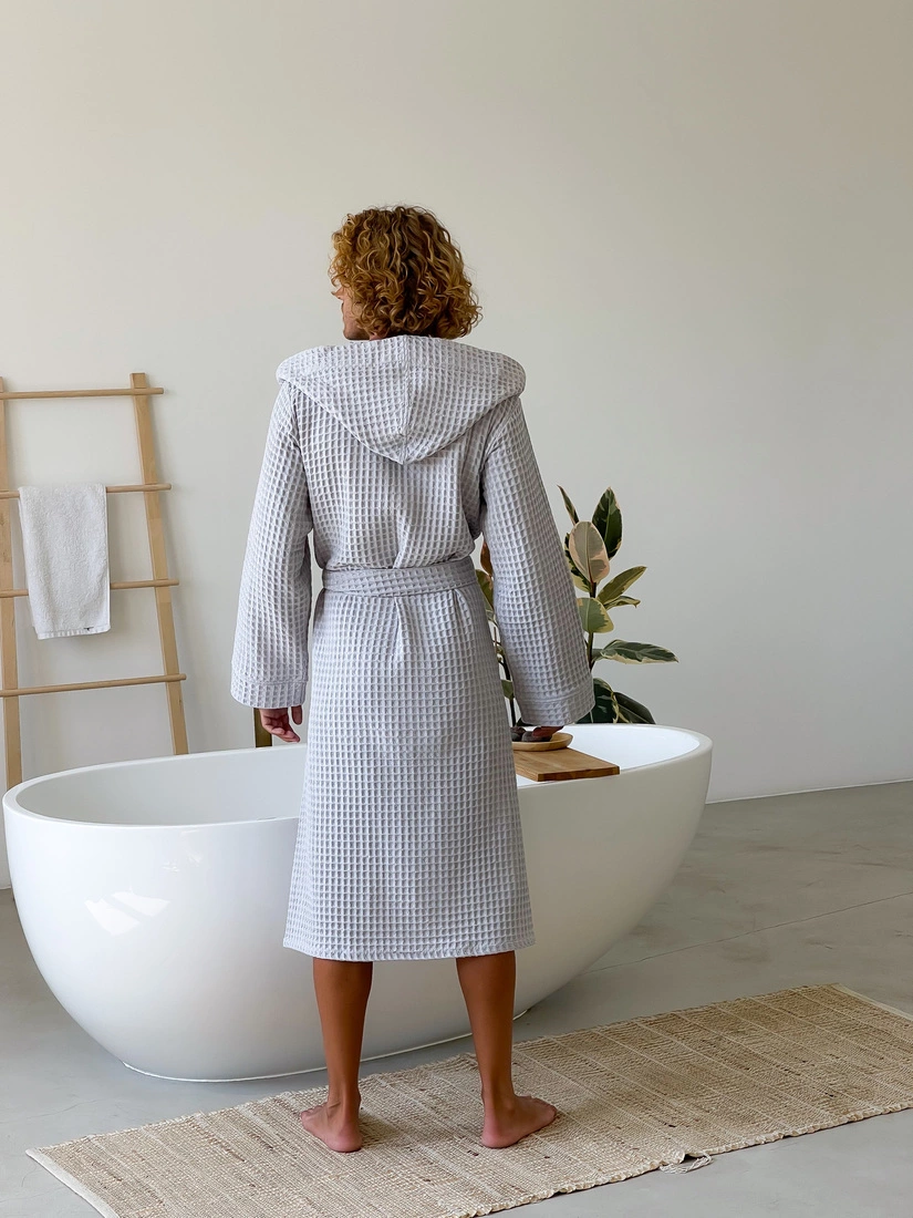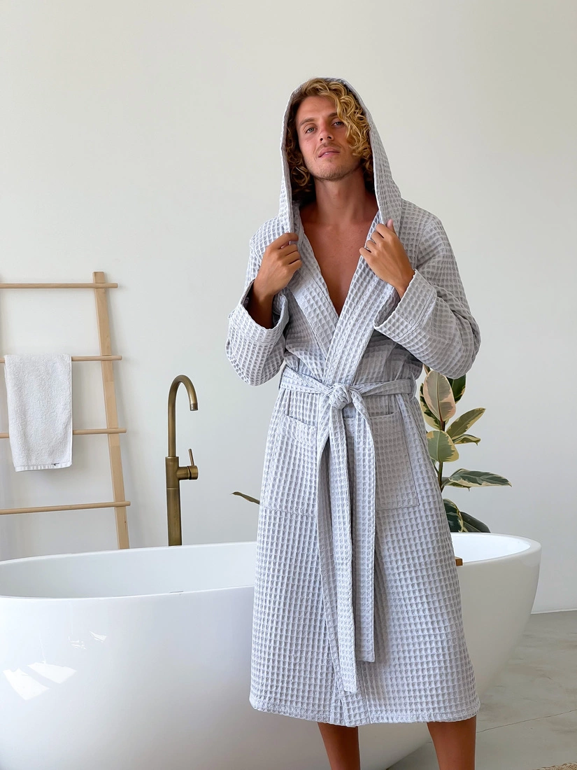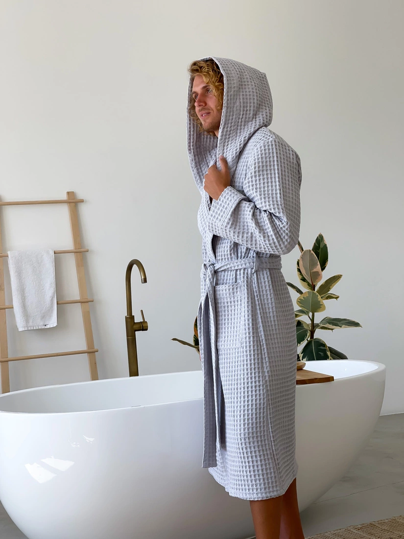 Стильний банний халат з капюшоном приємний до тіла і добре вбирає воду, його дуже приємно вдягнути після лазні або душу. Ідеальний для прохолодної пори року. Щільна та натуральна тканина допоможе швидко зігрітися. Тканина добре "дихає" і не створює парникового ефекту.
