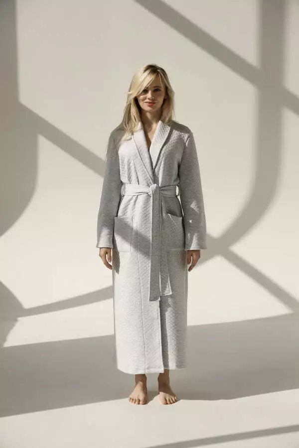 Вишуканий сірий меланж надає халату універсального стилю, який легко впишеться у ваш домашній гардероб. Довжина виробу додає відчуття захищеності та тепла, а зручний крій дозволяє вільно рухатися. Стьобана фактура додає виробу сучасності та робить його ще більш привабливим.