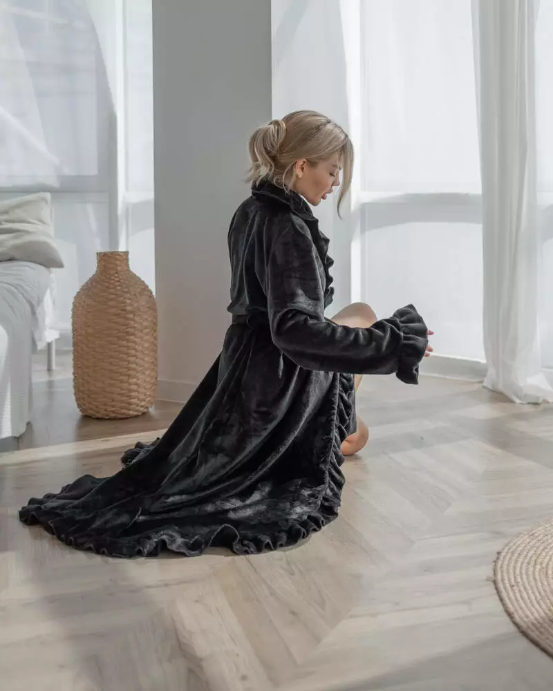 Халат із якісної плюшевої махри, дуже приємний та мякий, не викликає подразнень на тілі. Ви зможете загорнутися в нього прохолодним ранком або відразу ж після ванни, щоб зберегти тепло. Халат просто незамінний для дому, якщо ви хочете відчувати комфорт. Він прекрашений рюшами на рукавах та по краю всього виробу. -Тканина екологічна, гіпоаллергена, приємна на дотик, придатна для повсякденного носіння; -Халат на запах, з кишенями, є пояс; -Зручний крій, що не сковує рухів; -Не деформується, не линяє, не кашлатиться.