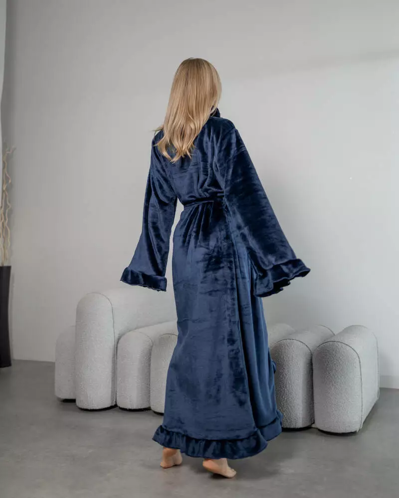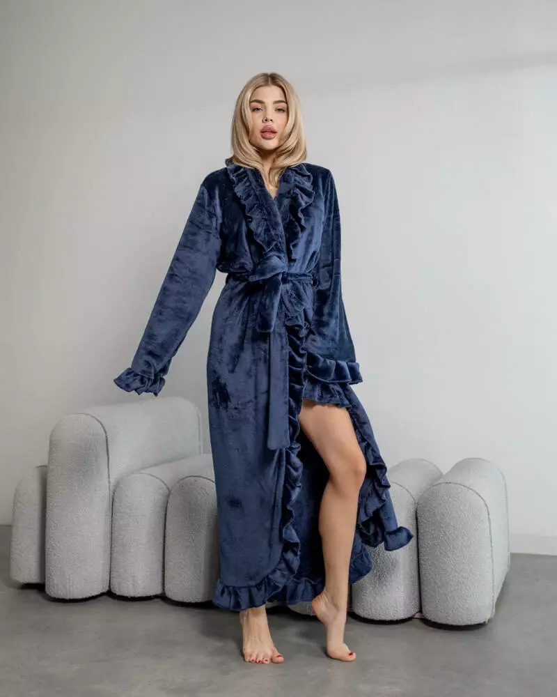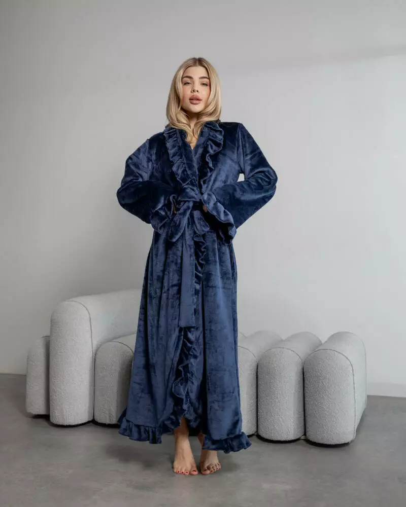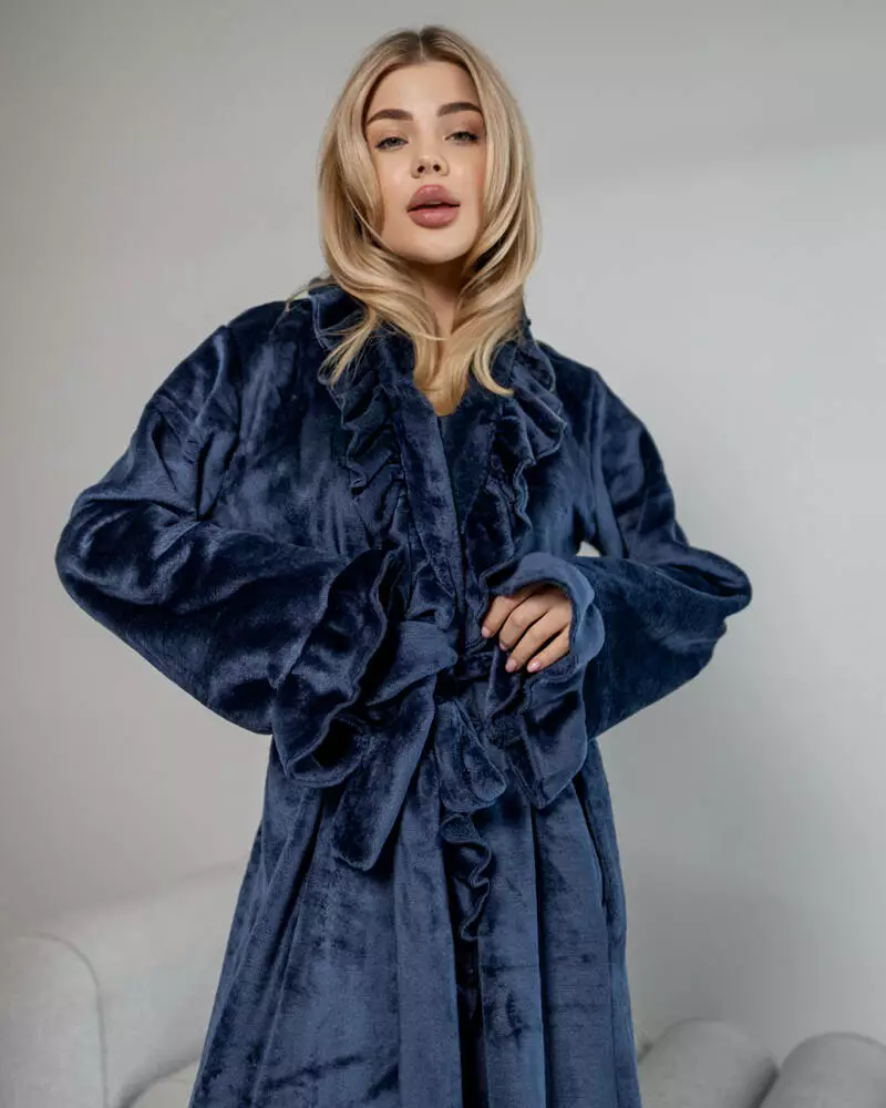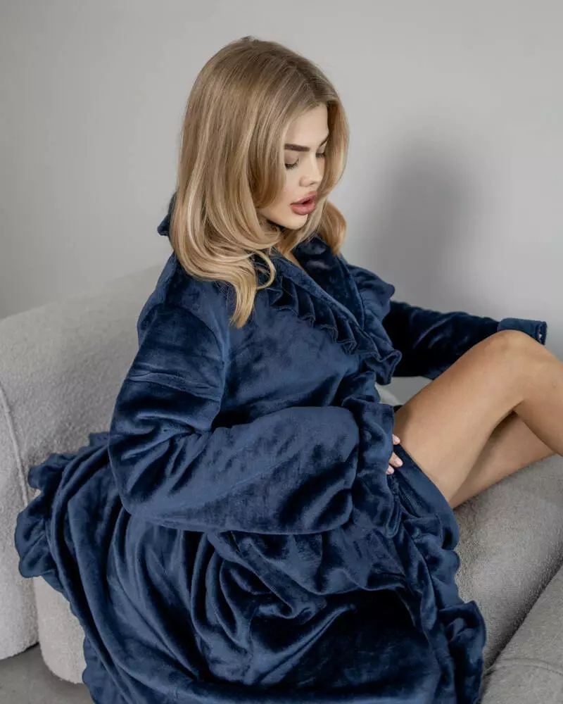 Халат із якісної плюшевої махри, дуже приємний та мякий, не викликає подразнень на тілі. Ви зможете загорнутися в нього прохолодним ранком або відразу ж після ванни, щоб зберегти тепло. Халат просто незамінний для дому, якщо ви хочете відчувати комфорт. Він прекрашений рюшами на рукавах та по краю всього виробу. -Тканина екологічна, гіпоаллергена, приємна на дотик, придатна для повсякденного носіння; -Халат на запах, з кишенями, є пояс; -Зручний крій, що не сковує рухів; -Не деформується, не линяє, не кашлатиться.