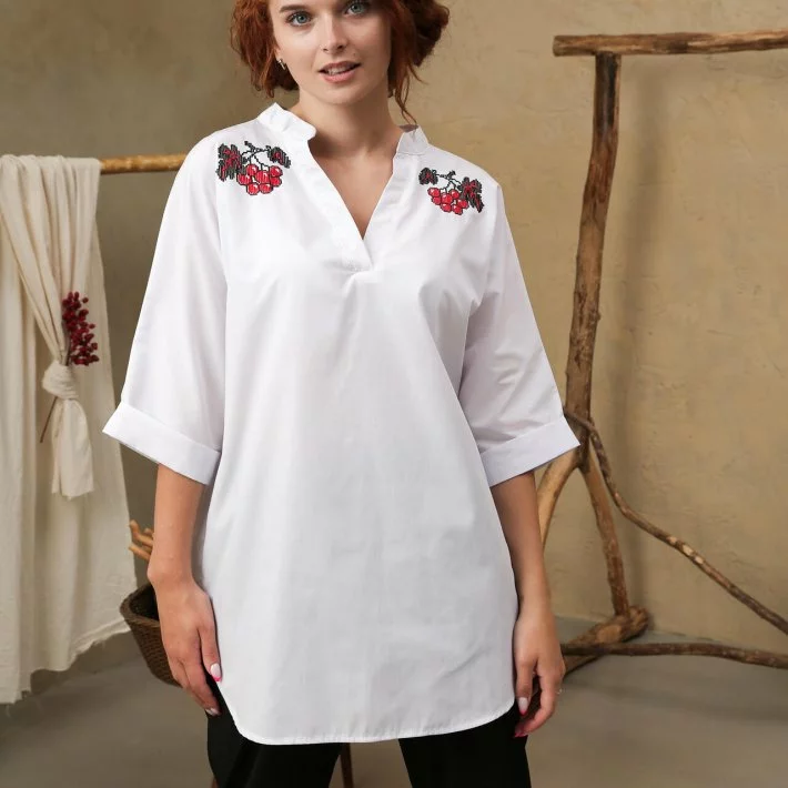 Блуза-туніка прямого силуету, має оригінальний крій горловини, низ