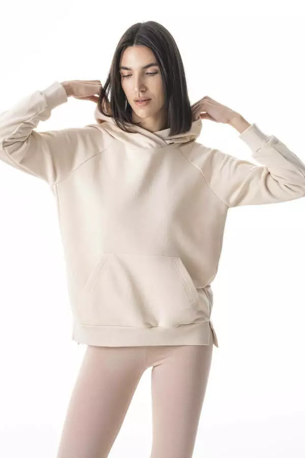 Бежевий колір універсальний і легко комбінується з іншими елементами одягу, будь то джинси, спортивні штани чи легінси. Простора кишеня-кенгуру додає практичності, а манжети на рукавах і по низу худі забезпечують ідеальну посадку.
