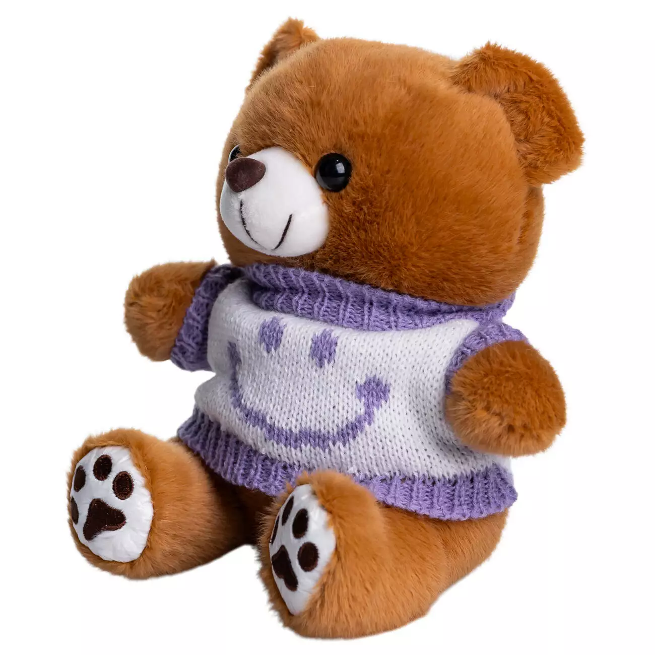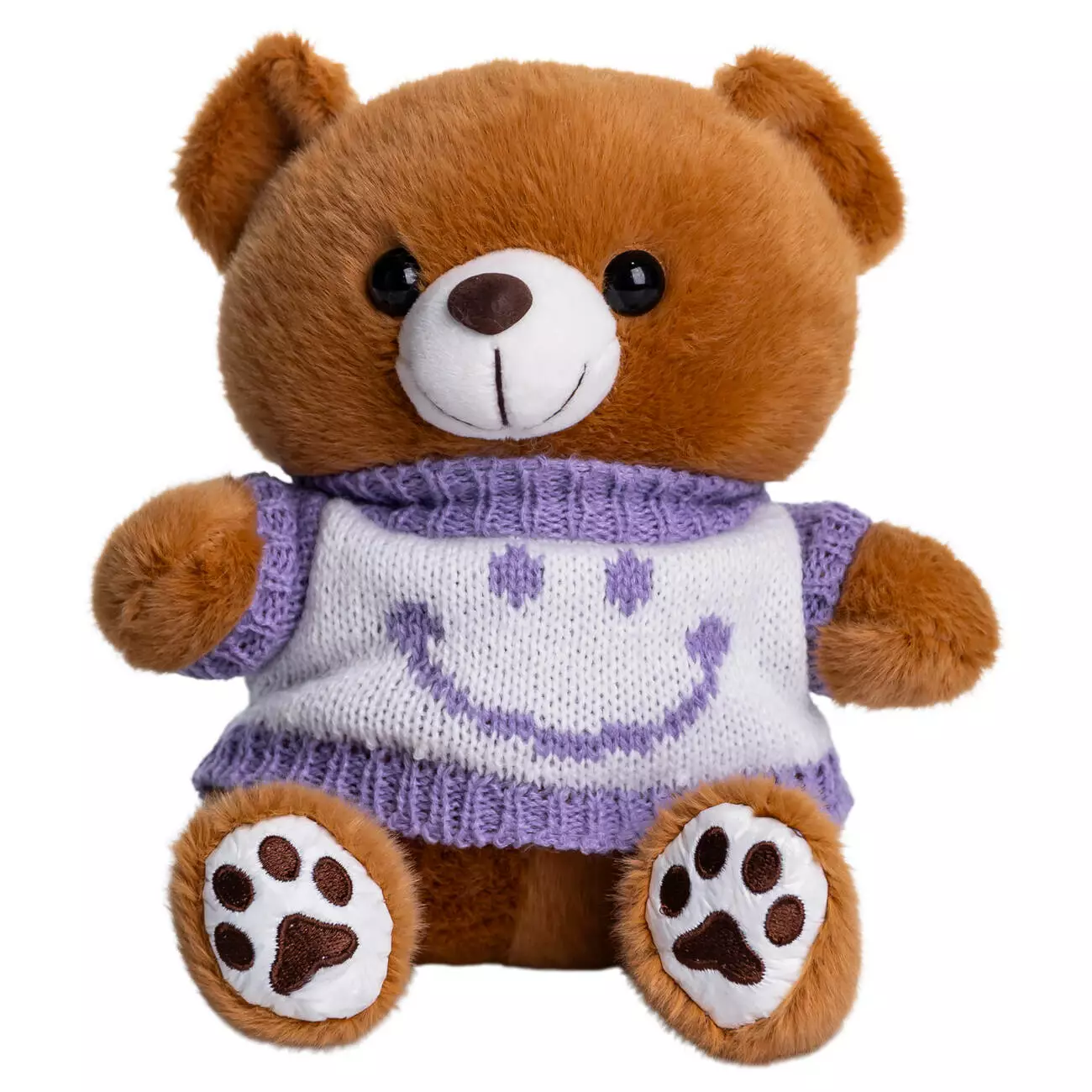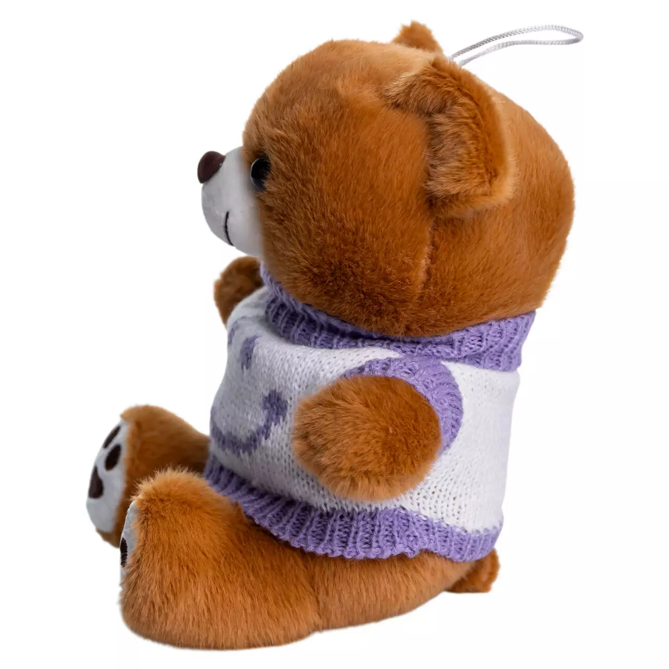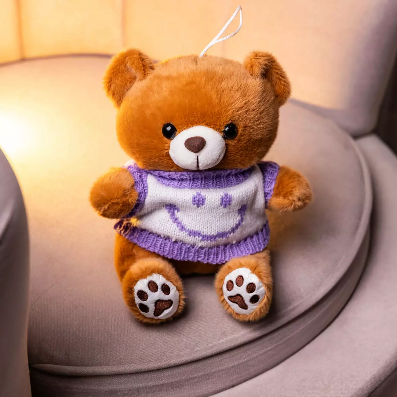 Позитивний аксесуар для тих хто цінує деталі. Контрастний светр зі смайлом додає образу яскравості та робить іграшку помітним акцентом. Комбінація м'якого плюшу та машинної в'язки забезпечує приємну на дотик фактуру, безпечну для дітей.