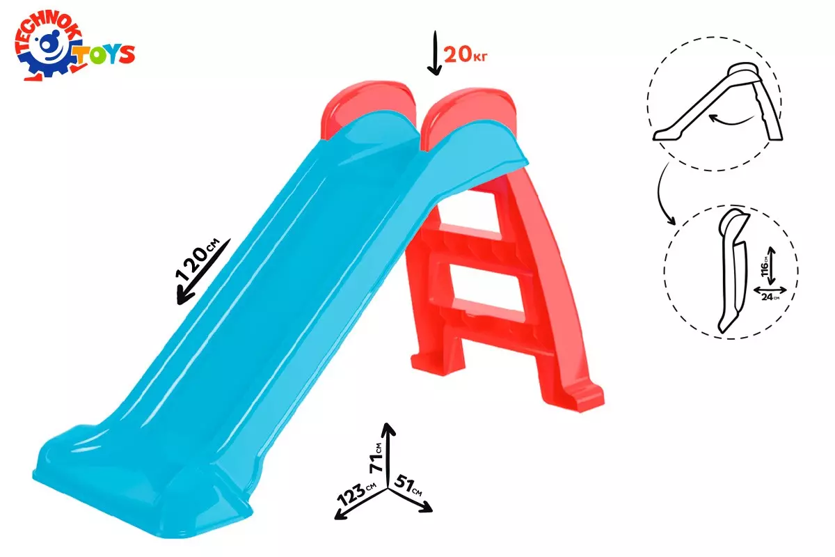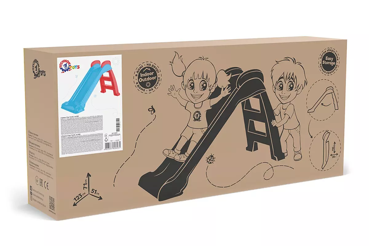 Усі діти – неймовірні непосиди. Активні та рухливі ігри особливо цікаві для хлопчиків та дівчаток. Для дітей від 2-х років найкращим подарунком буде домашня гірка ТехноК. Іграшка принесе море радості дітлахам , адже кататися на ній можна будь-якої пори року. Влітку - гірка стане прикрасою та головною іграшкою у дворі. Взимку вона не простоюватиме - компактні розміри дозволяють використовувати гірку також у кімнаті. Гірку ТехноК легко зібрати вдома або на дитячому майданчику, а при необхідності розібрати та скласти. У розібраному варіанті драбинка кріпиться до спуску на спеціальні гачки. У такому вигляді її ширина лише 24 см, тому гірку зручно розмістити біля шафи або комірки. Конструктори та інженери нашої компанії ретельно працювали над іграшкою та врахували всі зауваження батьків та вихователів, вимоги та норми стандартів. Конструкція виробу надзвичайно міцна та стійка . Особливу увагу ми звернули на поєднання деталей виробу. Для того, щоб уникнути місць потенційної небезпеки, спроектовано суцільний спуск. Адже за відгуками батьків саме на місцях з'єднання верхнього майданчика та спуску відбувається руйнування виробу. Ще одним місцем, яке викликає страх у батьків, є отвори в ручках. Дитина може почати спуск, не вийнявши руку з цього отвору та травмуватися. Ручки гірки ТехноК суцільні, без наскрізних отворів . Поверхня сходів матова для запобігання ковзаннюпри підйомі сходами. Увага! Просимо батьків, вихователів, усіх, хто буде поряд малюків УВАЖНО перечитати інструкцію до гірки та неухильно дотримуватись вимог та рекомендацій! У Ваших руках здоров'я малюка! Гірка виготовлена із міцного якісного пластику без запаху, без гострих країв. Яскраві барвники не вигоряють на сонці і забезпечують яскравий колір іграшки протягом тривалого використання. Розмір іграшки в розкладеному вигляді – висота – 123 см, ширина 51 см, довжина – 71 см. Довжина спуску 120 см. Для дітей від 2-х років. Максимальне навантаження – 20 кг. Упаковка – коробка з гофрокартону 117,5х51х29 см. Вага 4500 г габаритні розміри 123 х 71 х 51 см Розміри упаковки 117.5 х 51 х 29 см