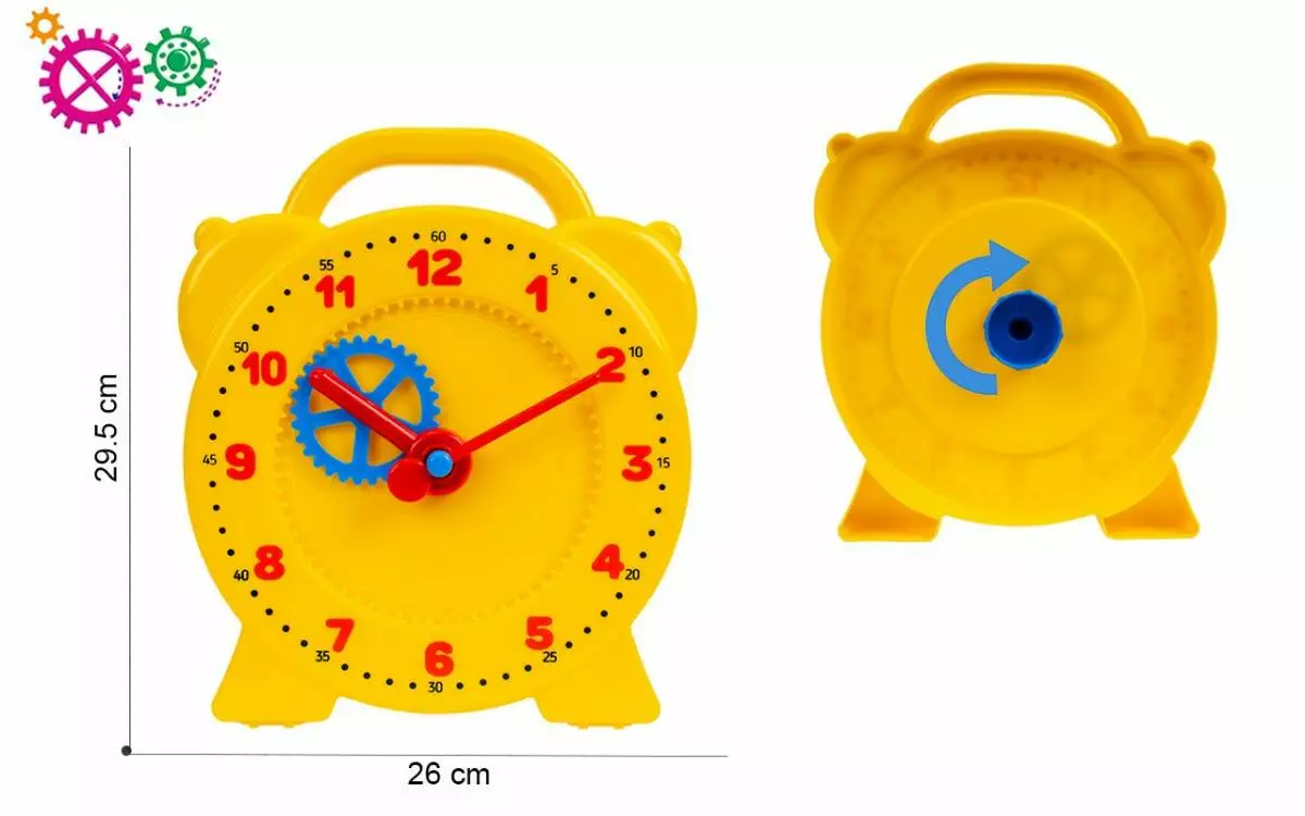Іграшковий "Годинник ТехноК" неодмінно стане у пригоді всім, хто працює з дітьми: батькам, вихователям та вчителям. Навчити дитину розуміти час -складний процес, обов'язковий в пізнанні навколишнього світу. Годинник ТехноК – це не тільки цікава іграшка, а й ефективне навчальне приладдя. Він знайде своє місце в молодших класах шкіл та ігрових кімнатах дошкільних закладів. Виконувати завдання з посібником-іграшкою буде легше та цікавіше.З "Годинником ТехноК" уроки будуть проходити жваво та корисно. При створенні годинника ми орієнтувалися на вимоги національної програми "Нова Українська школа". З іншого боку, на думку педагогів, іграшка-годинник на видному місці в кімнаті малюка сприяє початковому розвитку таймінгу дитини. "Годинник ТехноК", як і "дорослі" годинники, має годинну та хвилину стрілки. Кольоровий циферблат додає наочності та полегшує процес навчання. Червоними цифрами вказані години, а синіми відмітками - хвилини. Особливість "Годинника" від ТехноК є спеціальний механізм, завдяки якому стрілки рухаються синхронно. При оберті навколо осі хвилинної стрілки менша, "годинна" переміщується рівно на одну годину. Обертати стрілки можна за допомогою спеціальної шестерні-ручки, що зручно розміщена на задній частині виробу, або ж просто за самі стрілки. Розміри годинникадозволять використовувати його як для індивідуального навчання, так і для роботи з класом або групою в дитсадку. Завдяки міцним та стійким ніжкам годинник зручно розмістити на парті, на видному місці в кімнаті, наприклад, на поличці. Іграшка "Годинник ТехноК" стане чудовим доповненням у дитячих кімнатах, гуртках та шкільних класах. Годинник виконаний з високоякісного пластику, без запаху. Пакування– кольоровий картонний пояс. Для дітей від 5-и років