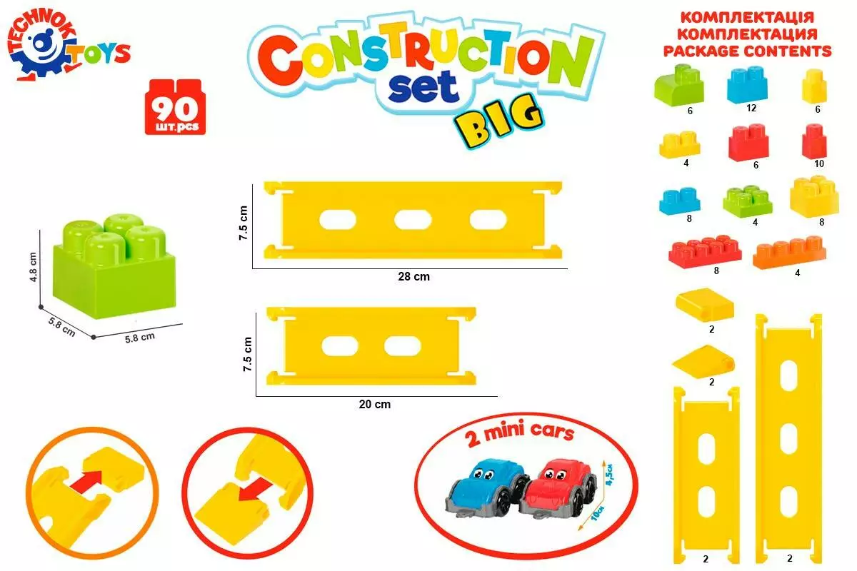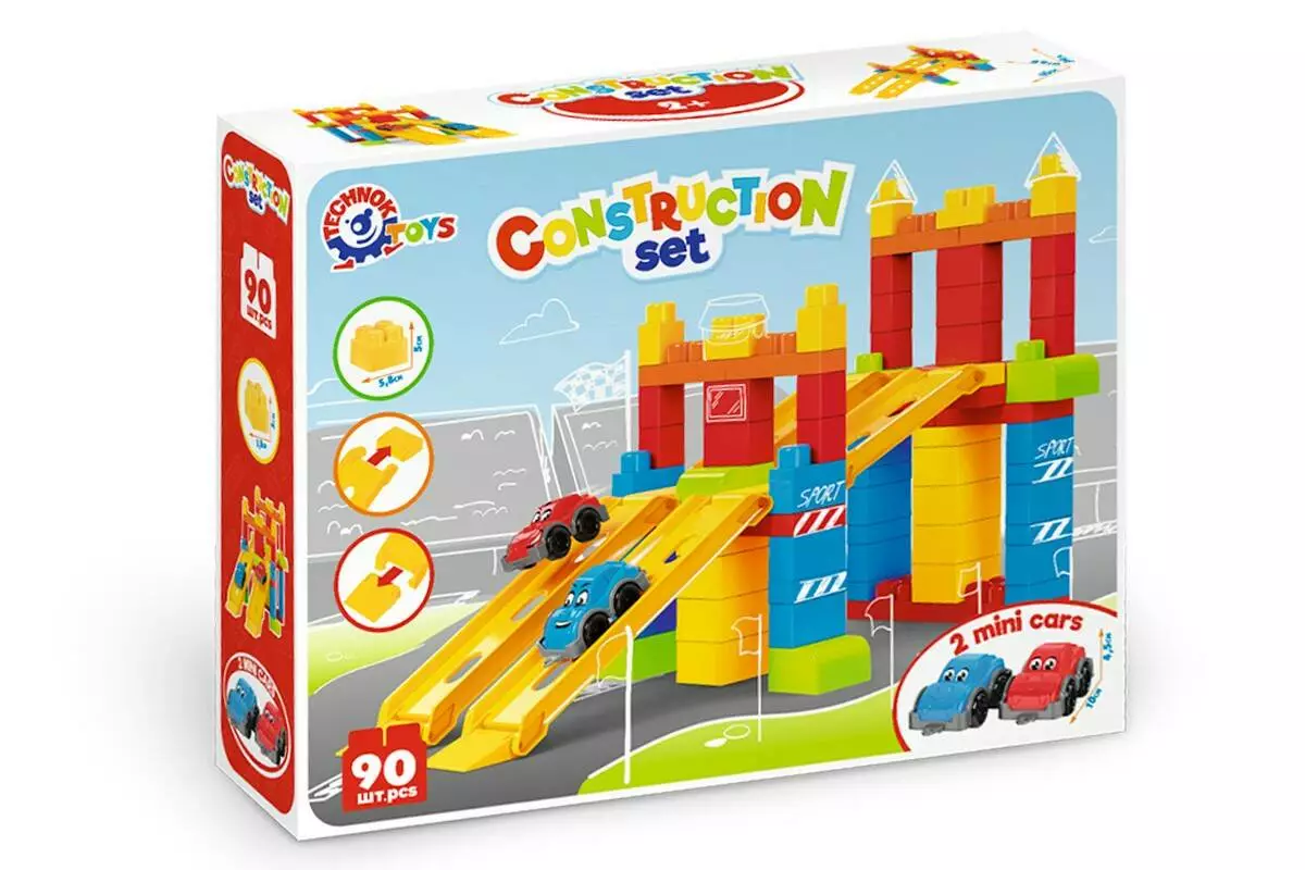Машинка чи конструктор? Ох, як важко інколи вибрати, адже так хочеться обидві іграшки. А з новинкою "Конструктор ТехноК" Ваш малюк отримає безліч емоцій, адже це цікавий конструктор, швидкісні траси та машинки в наборі. Іграшка "Конструктор ТехноК"– це 90 різноманітних елементів, серед яких цікаві спуски, траси та машинки. Будівельні цеглини великі та зручні для діточок вже від 2-х років. З них можна збудувати різноманітні фігури: гаражі, паркінги, будиночки, кораблі чи фігури тваринок. А швидкісні траси та 2 спорткари неодмінно подарують діткам незабутні емоції. Як цікаво організувати з друзями перегони та запускати машинки на спусках. Спорткари з "оченятами", нанесені методом тамподруку – цікава опція, яка додає "життя" конструктору. На допомогу юним будівельникам – детальна покрокова інструкція. Конструктор – одна з найпопулярніших іграшок серед дітей різного віку. Адже це не тільки захоплива гра, а також корисне розвивальне та навчальне приладдя. Можна сконструювати автомобіль, будиночок, космічний корабель та вивчити додавання і дроби! "Конструктор ТехноК" відповідає всім вимогам безпеки, в елементів відсутні гострі краї та сторонній запах. Деталі мають яскравий колір, що не залишається на дитячих пальчиках. Цеглини приємні на дотик, легко складаються, водночас зібрана конструкція міцна та тримає форму. Кольорова покрокова інструкція є необхідністю, особливо коли дитина знайомиться з конструктором. Збираючи моделі згідно з інструкцією, малюки досліджують можливості конструктора та вивчають ази побудови базових фігур. Чим все ж таки корисні ігри з конструктором? Головна перевага цієї іграшки — це розвиток важливих навичок для повноцінного розвитку дітей. Конструювання з різних елементіврозвиває дрібну моторику та допомагає тренувати координацію рухів. Також, батьки, граючись з дітками, вчать їх новим словам: назви кольорів, форм, тварин, будівель та транспорт. Складаючи цілу конструкцію, у дітей розвивається уява та просторове мислення. Захопливі ігри з конструктором виховують увагу, терпіння та посидючість. Граючись разом, дітки розвивають соціальні та комунікативні навички. Їм доводить співпрацювати, обговорювати подальші кроки та домовлятися для розв'язання поставлених задач. Пробувати, експериментувати, помилятися та переробляти по новому. Ми вчимося через гру, створюючи щось нове, дізнаємося більше про себе та світ! Іграшка "Конструктор ТехноК" з автотреками сумісна з іншими моделями серії, а саме арт. 6818 та 6801. Пакування – яскрава коробка (49,3 х 38 х 12 см). У наборі 90 елементів та інструкція. Для дітей від 2-х років.