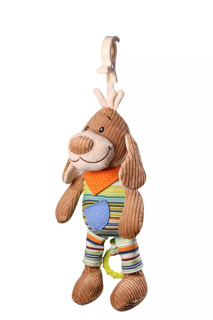 <p><em>Весела собака може бути справжнім другом будь-якої дитини. Вельветова тканина і кишеня на животі залучають пальці дитини для вивчення форм і фактур, а мелодія музичної скриньки заспокоює дитину.</em></p><p><strong>ВЛАСТИВОСТІ:</strong><strong></strong></p><ul><li><em>відточує почуття дитини зір і слух;</em></li><li><em>звуки музики допомагають дитині розрізняти різні гучності звуку;</em></li><li><em>нагадуючи реальні фігури людей і тварин, іграшка допомагає малюкові розпізнати їх силуети;</em></li><li><em>викликає інтерес у дитини і концентрує його увагу;</em></li><li><em>має заспокійливий і заспокійливий ефект, що допомагає дитині заспокоїтися і заснути.</em></li></ul><p><strong>ТЕХНІЧНІ ДАНІ<br>РОЗМІРИ:</strong></p><ul><li><em>без затискача - 36см</em></li><li><em>із затискачем - 45см</em></li></ul>