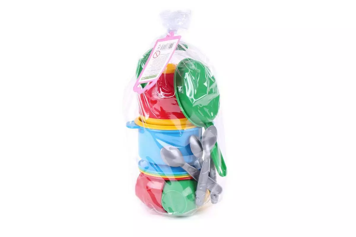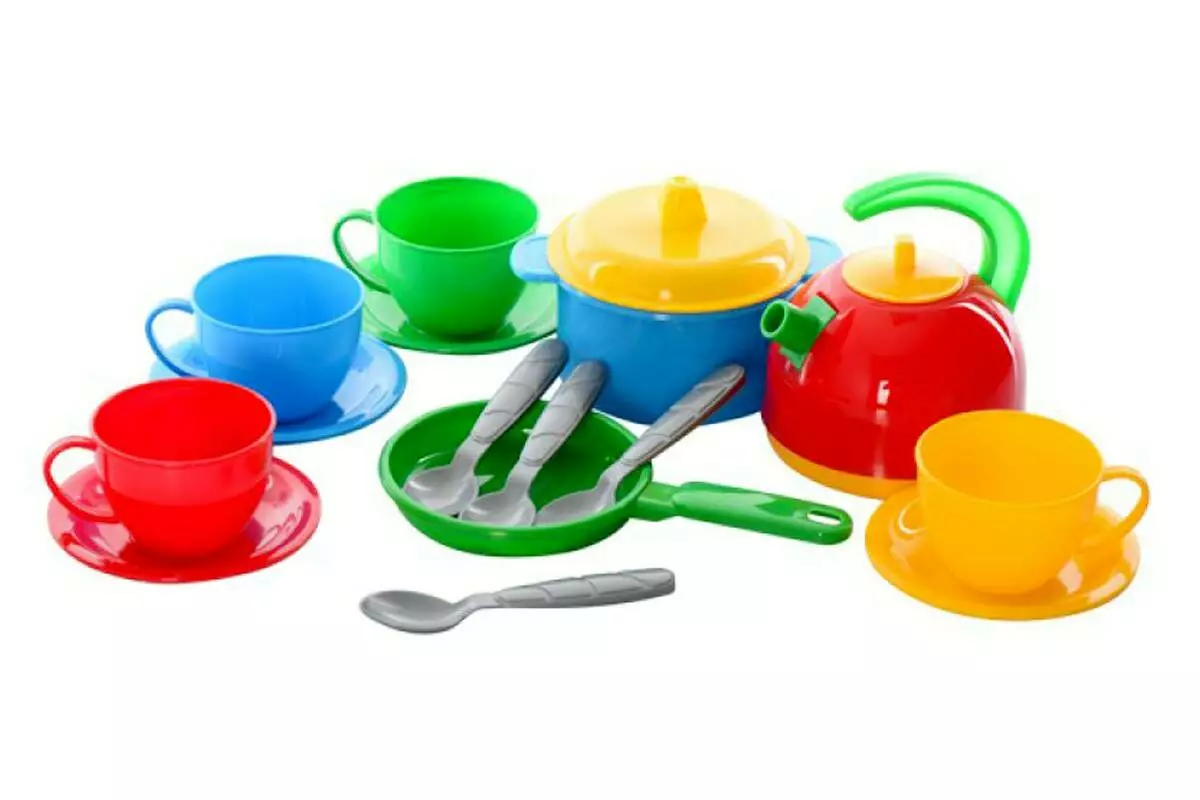 Вага 155 г Габаритні розміри 23 ? 11 ? 11 см Комплектація: 1 чайник, 1 каструля, 1 сковорода, 4 ложки, 4 чашки, 4 блюдця. Що може бути цікавіше для дівчинки, ніж яскравий і красивий набір іграшкового посуду, з яким можна грати в пісочниці, у дворі і навіть вдома? Набір дитячого посуду «Маринка» дозволить дитині перевтілитися в справжню господиню, поратися по кухні щоб нагодувати смачним обідом своїх ляльок і м'яких звірят. В ігровій комплект посуду для дітей входить сковорідка, чайник, каструля і, звичайно ж миленький сервіз з кольоровими чашечками і ложками. Дитина зможе взяти свою нову дитячу гру на вулицю і влаштувати сюжетно-рольові дочки-матері зі своїми подружками або з ляльками, розвиваючи при цьому свою фантазію і купуючи необхідні для майбутньої господині якості: відповідальність і серйозність.
