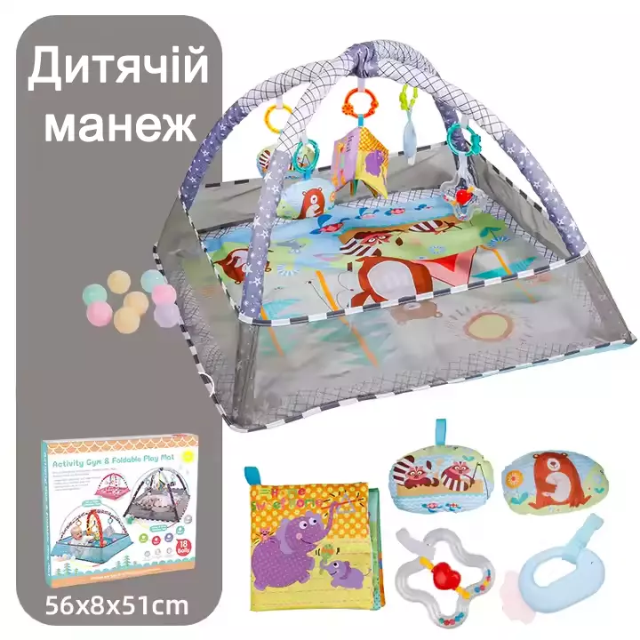 Комплектація: килимок, 5 підвісних іграшок, 18 пластикових
