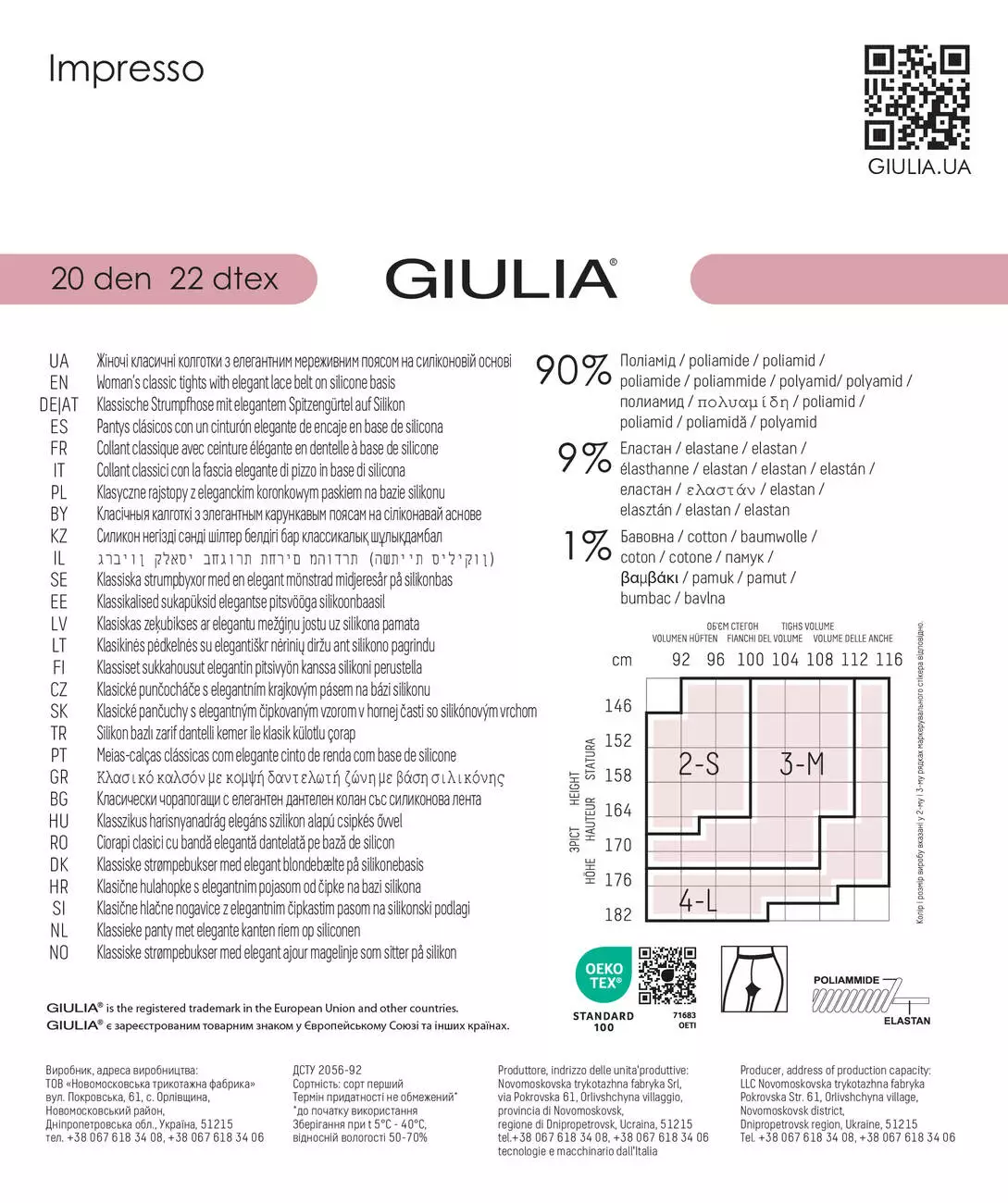 У колготок Giulia IMPRESSO 20 класичний дизайн з унікальною деталлю - витонченим широким поясом з ажурного мережива з романтичним квітковим візерунком на якісній силіконовій основі. Плоскі шви та щільність 20 den роблять цю модель максимально комфортною у щоденній носці. Колготки надійно фіксуються і чудово сидять на стегнах і талії, не врізаються в шкіру, не сповзають і не передавлюють. Висота посадки на талії - середня, а також є гігієнічна ластовиця з бавовни для додаткової гігієни.