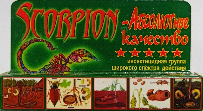 Скорпион — двухкомпонентный инсектицид против почвенных вредителей. Препарат предназначен для борьбы с насекомыми-вредителями на различных стадиях их развития. Действующие вещества — фипронил, зета-циперметрин. Препарат Скорпион имеет длительное действие, а также активен при повышенных температурах. Инсектицид не накапливается в растениях и почве. Используется для орошения и для приготовления приманок. Совместим со многими удобрениями и пестицидами.