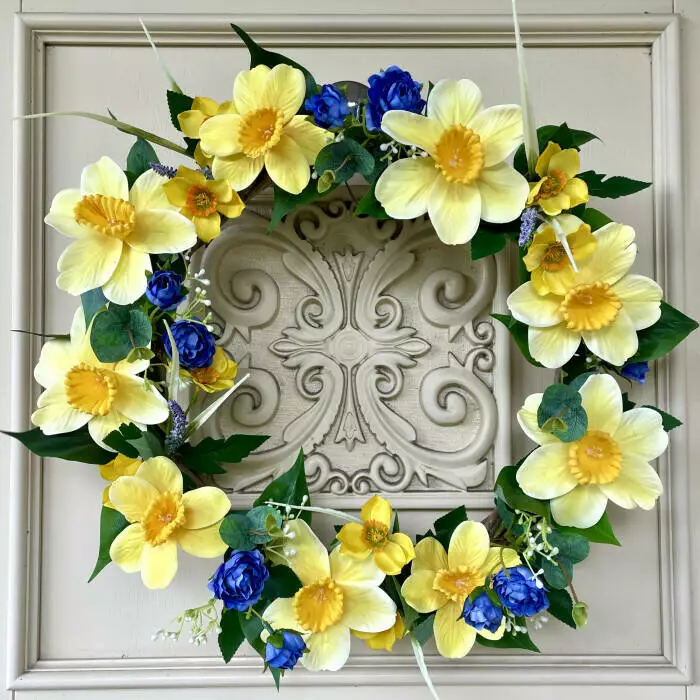 Позвольте весеннему настроению заселиться в вашем доме с помощью этого очаровательного интерьерного венка "Нарциссы". Изготовленны в оттенках желтого и голубого, он нежно расцветает, используя яркие латексные нарциссы и мелкие весенние цветочки.