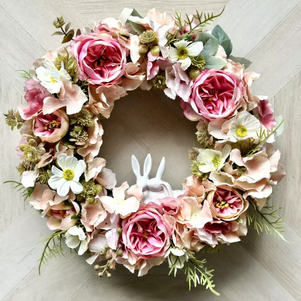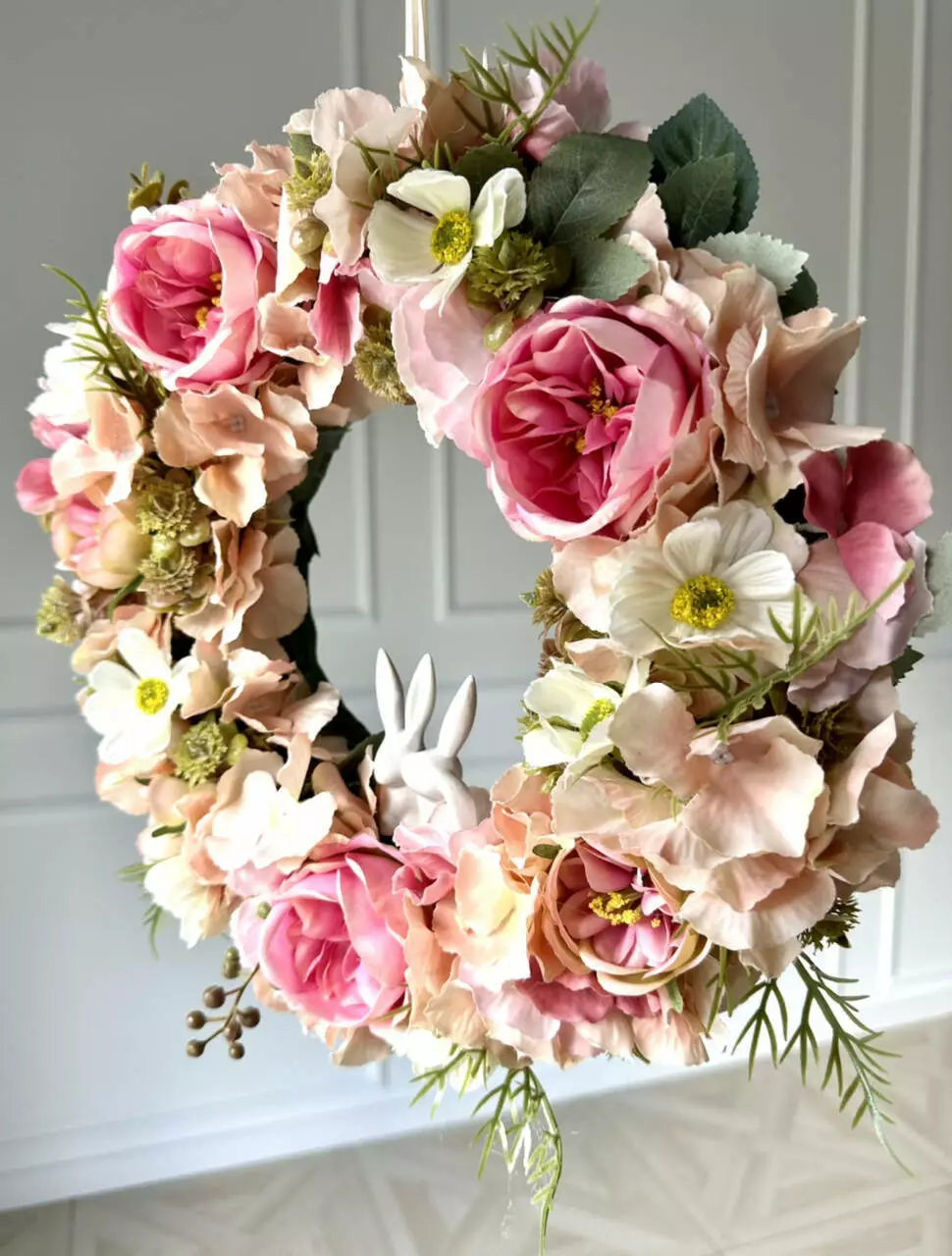 Ніжність — це декоративний вінок ручної роботи, створений для того, щоб додати вашому простору світла, тепла й естетики. Композиція з ніжно-рожевих гортензій, білої космеї та розкішних англійських троянд виглядає витончено та делікатно. У центрі — двоє керамічних зайчиків, які додають вінку особливого шарму й символіки турботи, любові та миру.