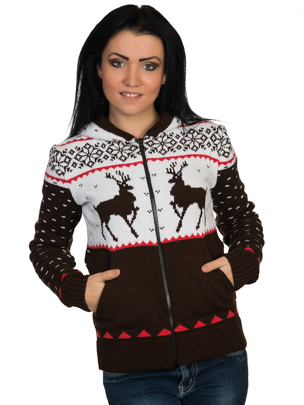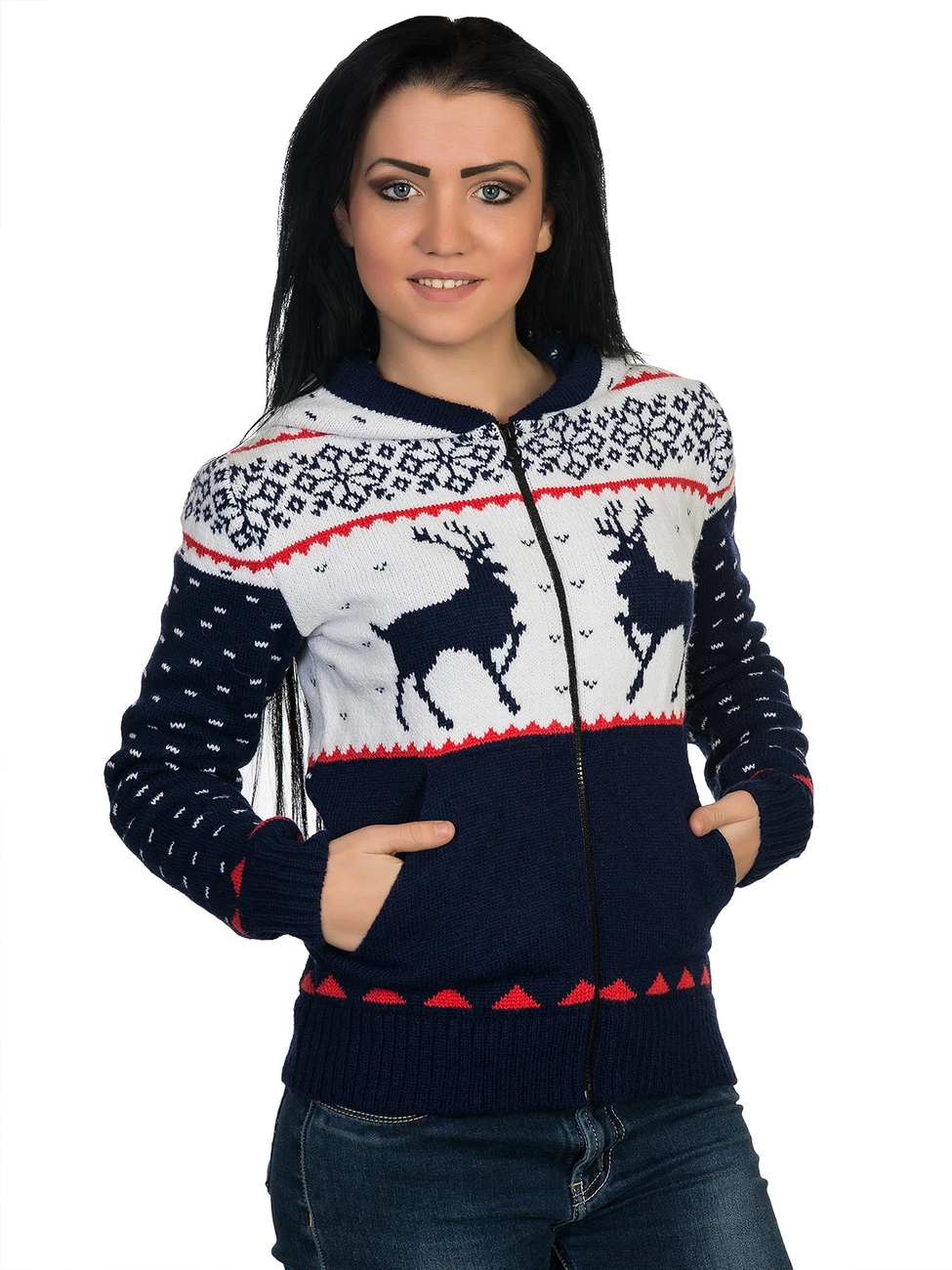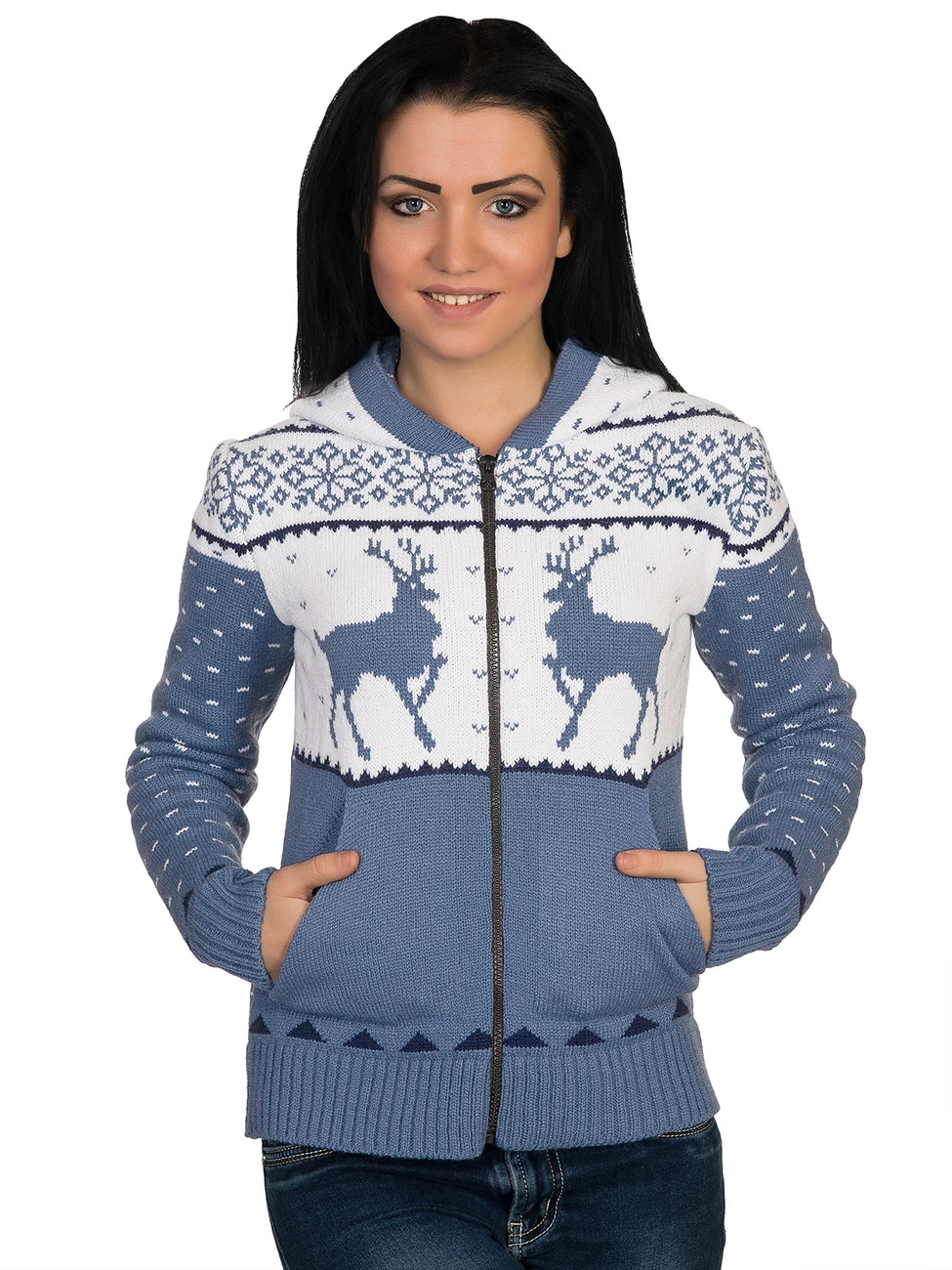 выполнена плотной жаккардовой вязкой, спереди на молнии. Модель