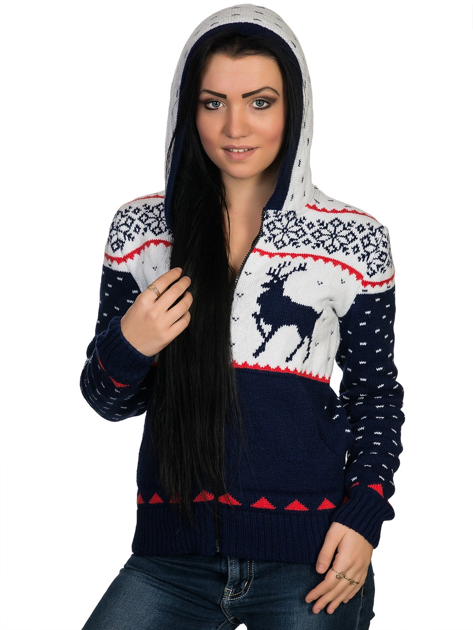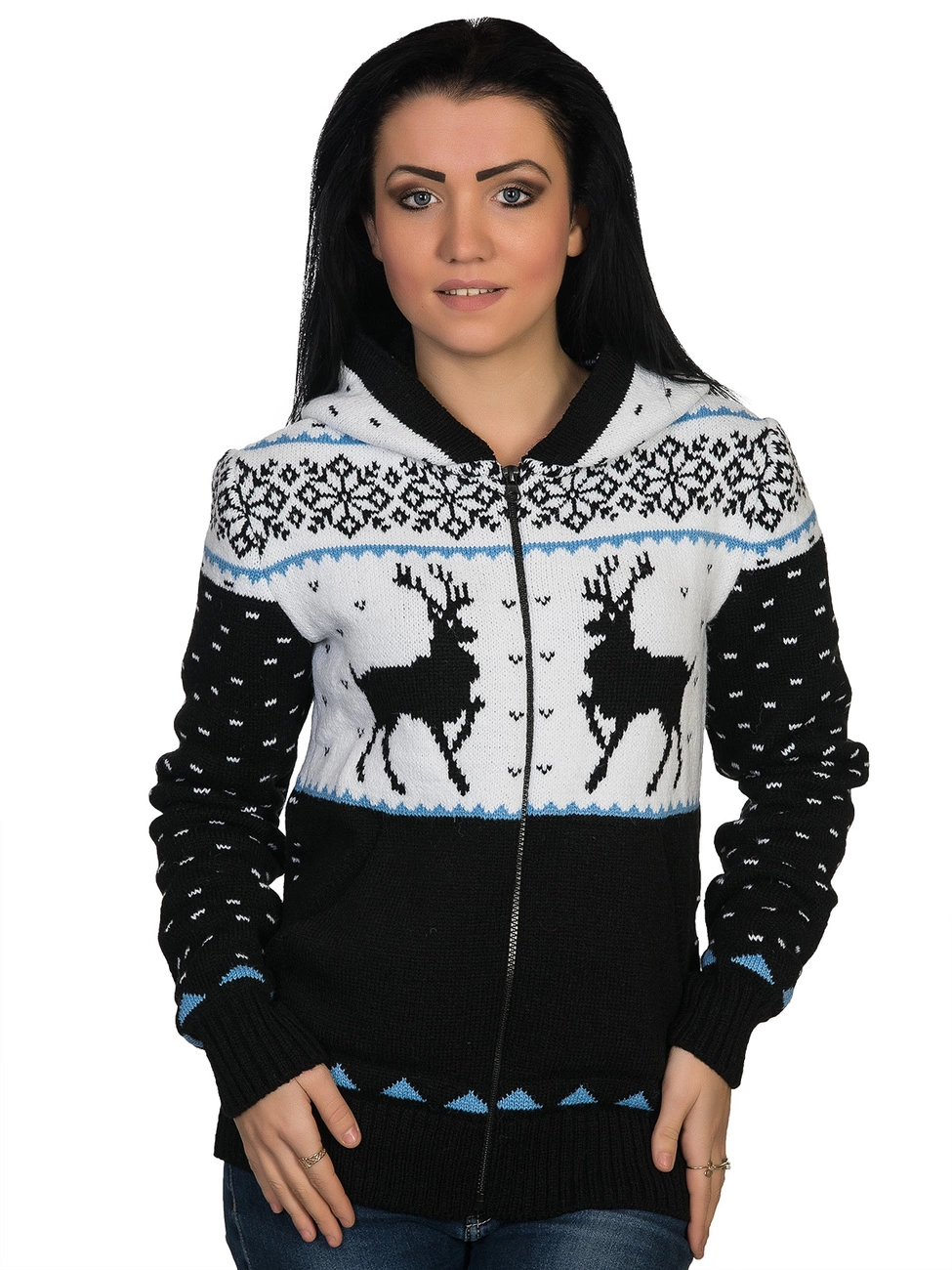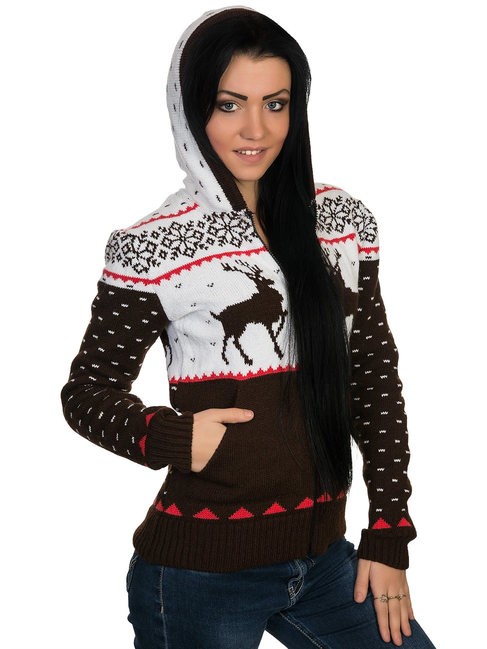 выполнена плотной жаккардовой вязкой, спереди на молнии. Модель