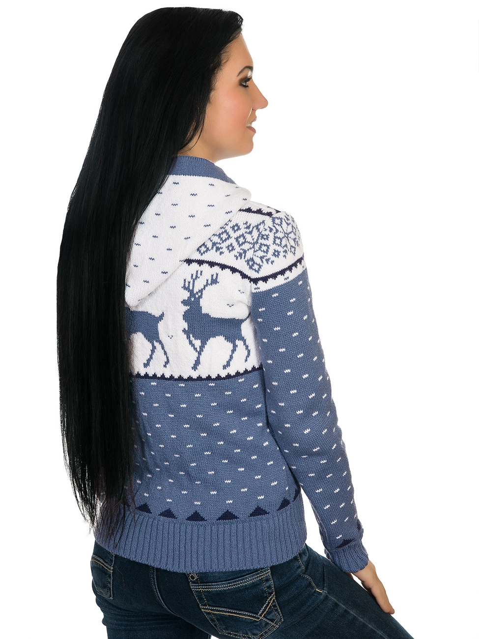 выполнена жаккардовым рисунком в виде оленей. Комфортная