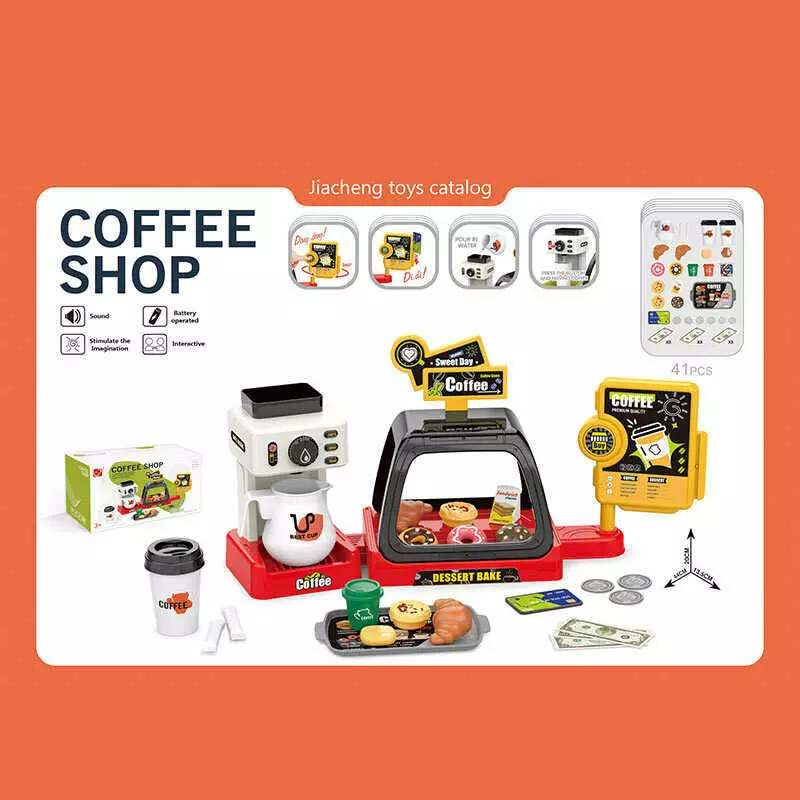 Кав`ярня 668-143 (36) 41 елемент, звукові ефекти каси, кавоварка наливає напій, вітрина з солодощами, стаканчики, круасани, пончики, в коробці