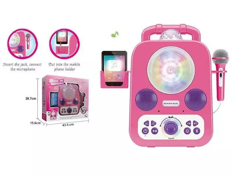 Головна > Каталог > Іграшки > Іграшкові музичні інструменти > Караоке 5023 (6) підсвічування, мікрофон, 12 мелодій, підключення до телефону, працює тільки від мережі, регулювання гучності, USB-кабель, в коробці оптом