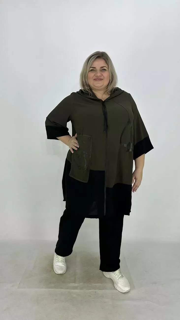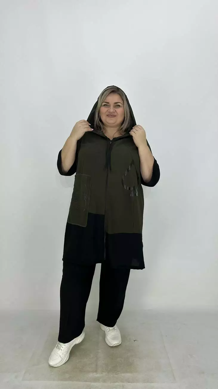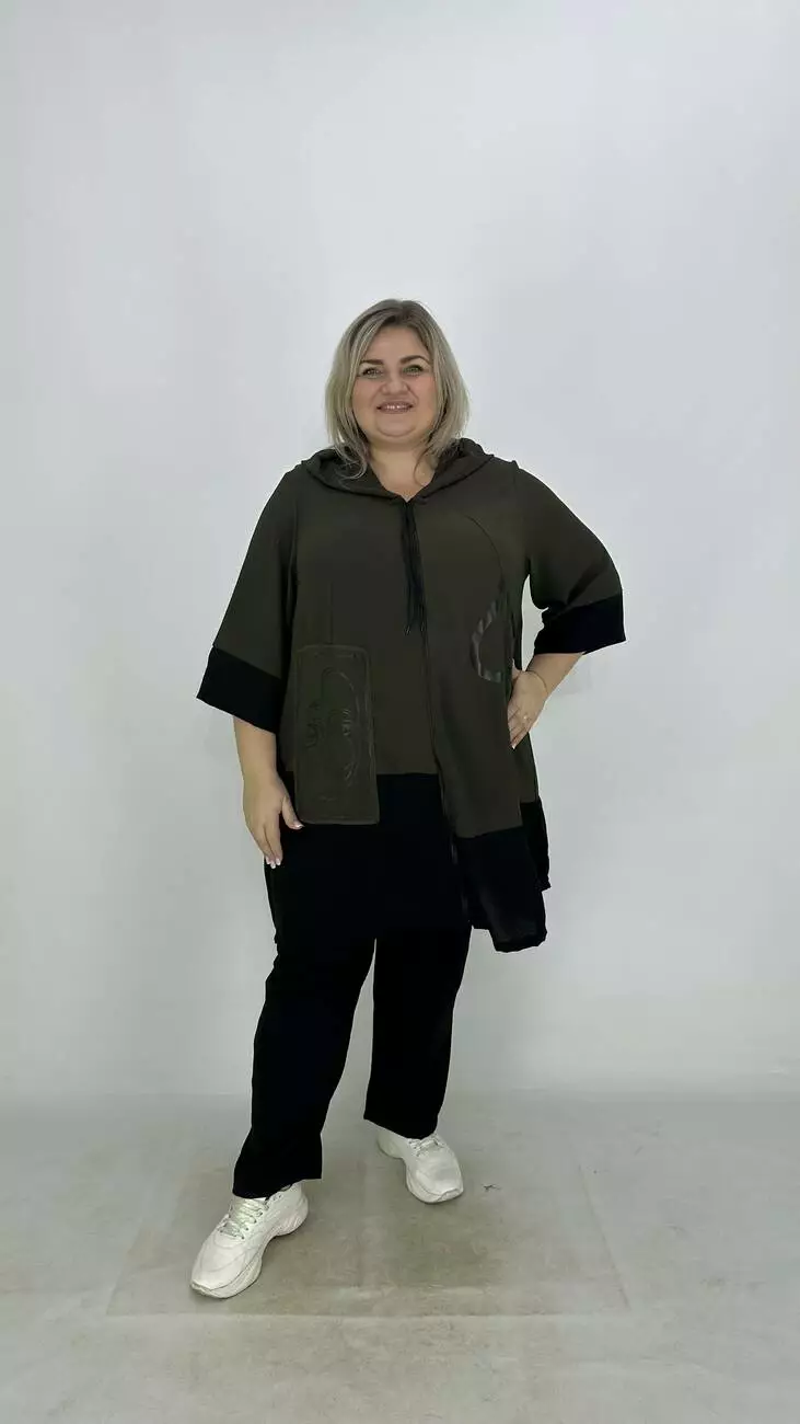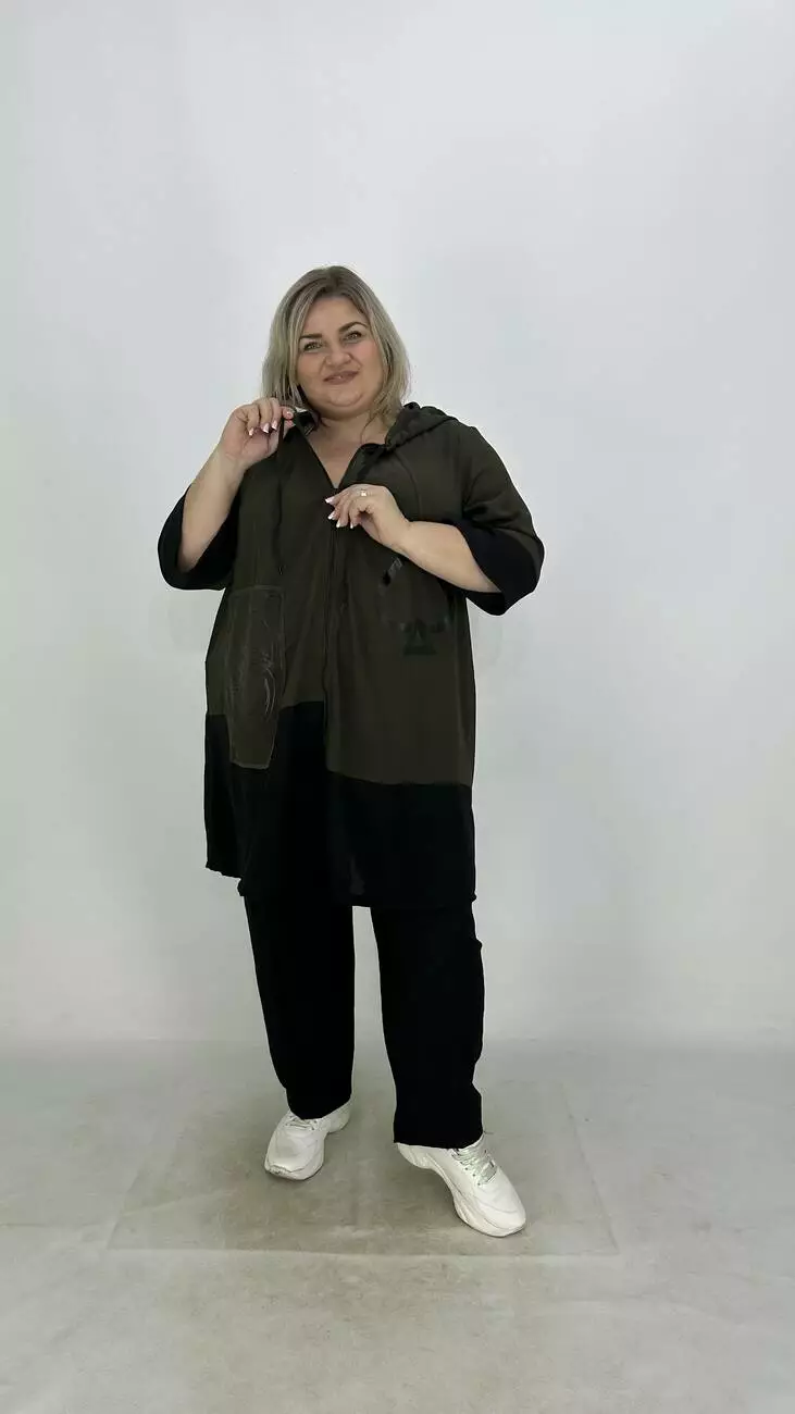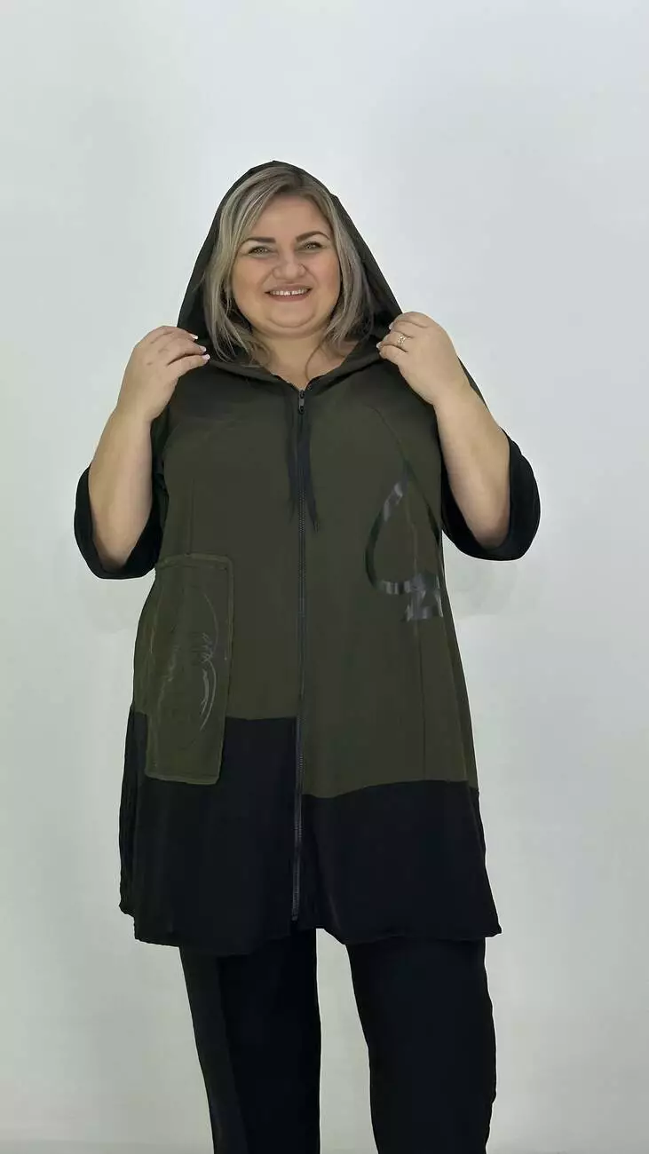 Легкий тонкий пильовик з американського крепу. Тканина трохи жата є невеликий стрєч, м'яка, приємна до тіла, не жарка. Силує трапеція. з капюшоном, застібка змійка прикрашена пришивними аплікаціями з якісним накатом.